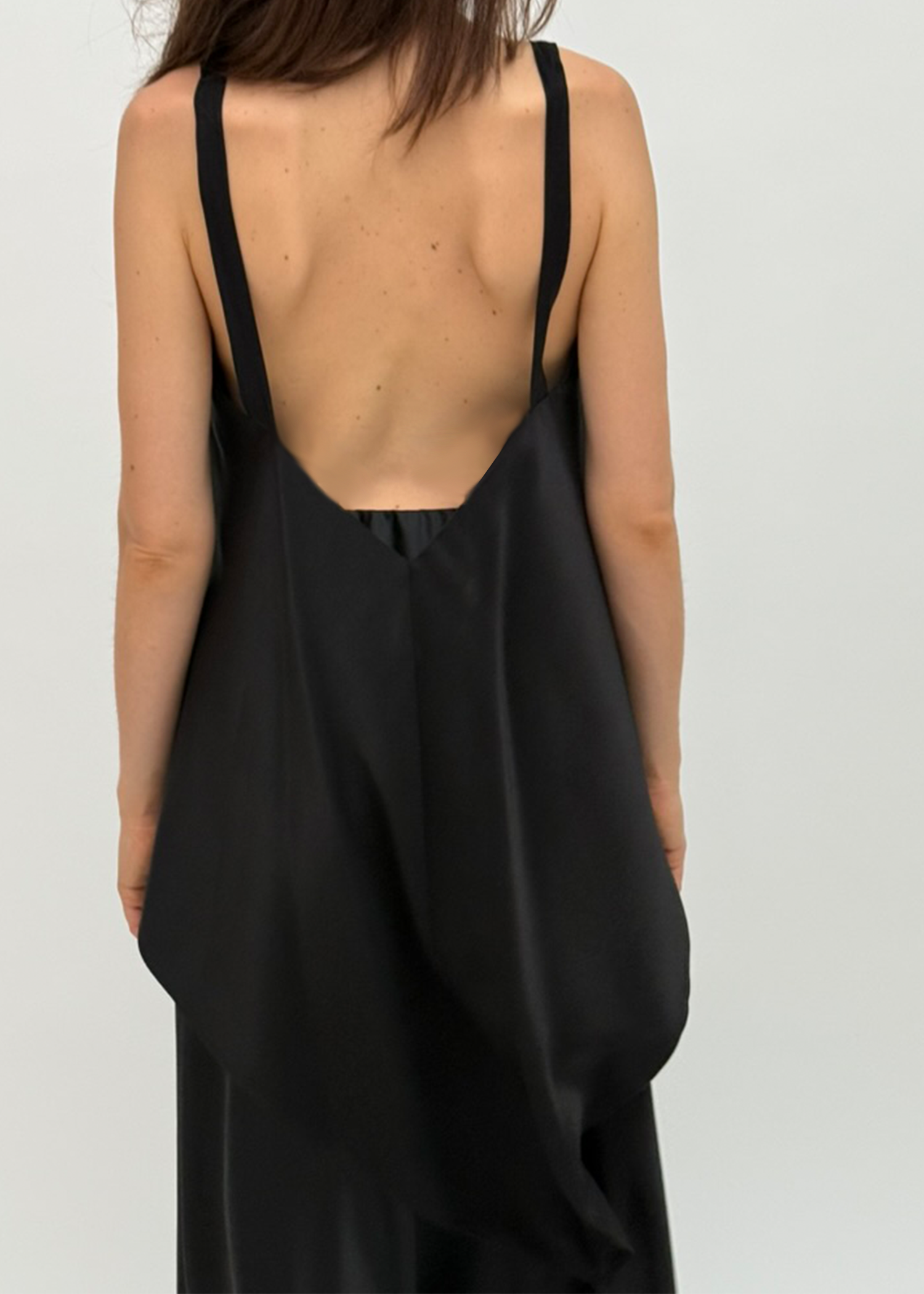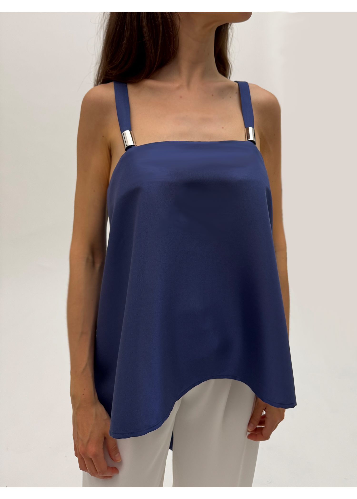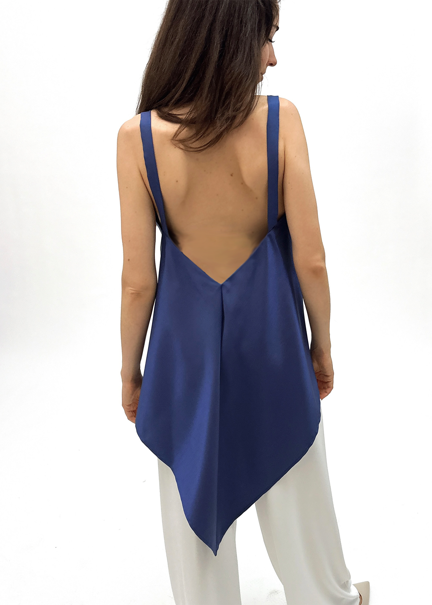 This elegant top is a bold yet refined choice for the modern woman. With a minimalist front and a strikingly open back, it surprises with its daring design. Thin straps adorned with metallic rings add a touch of sophistication, while the asymmetrically draped back brings a sense of lightness and fluidity. Perfectly pairs with wide-leg trousers or a fitted skirt – ideal for evening wear or a chic summer look.