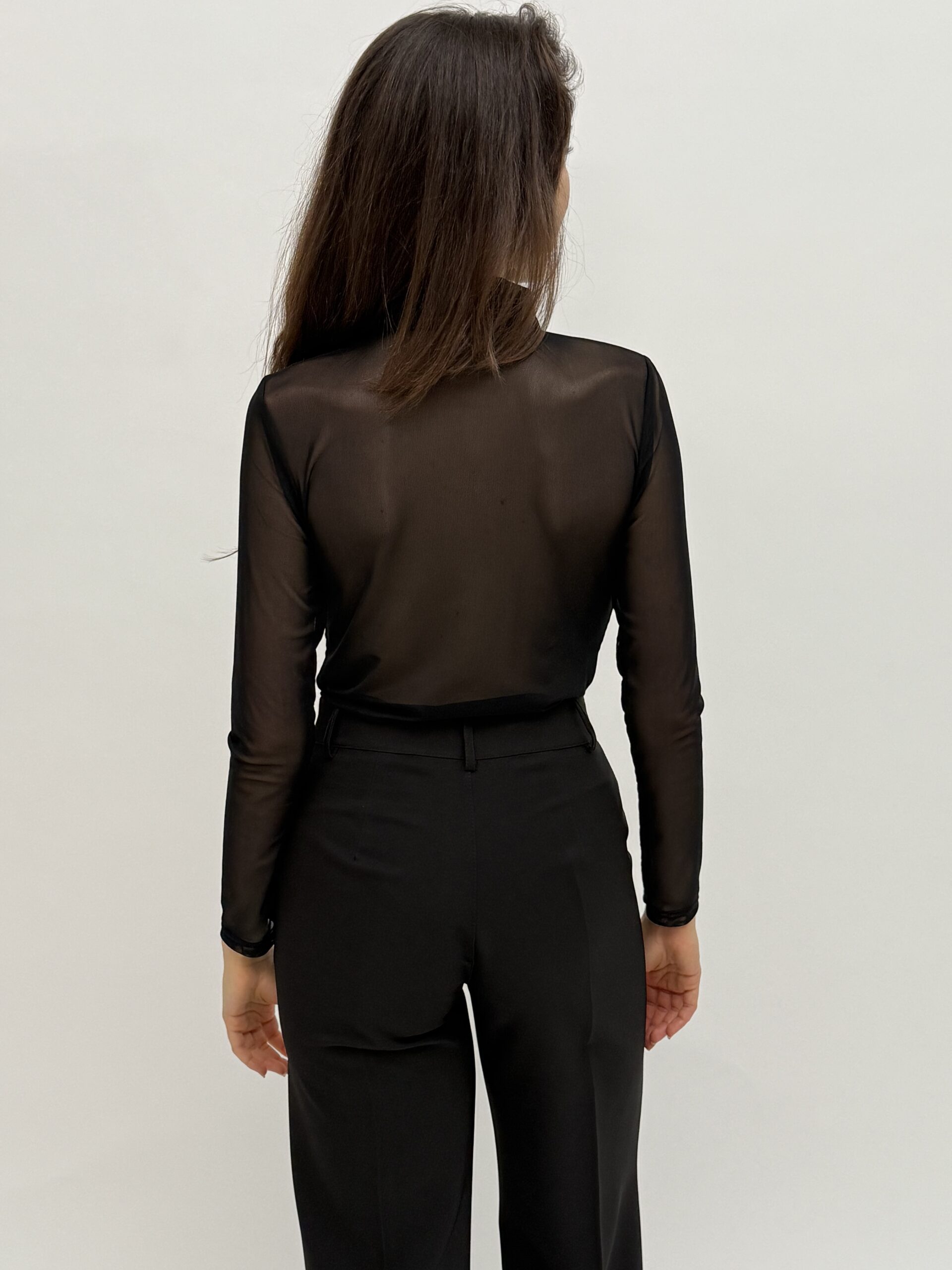 This black sheer body with 3D floral appliqués is a fusion of bold elegance and subtle femininity. The mesh fabric is breathable, while the shimmering floral details add a touch of glamour. With long sleeves and a classic button-up silhouette, this piece is ideal for special evenings or festive occasions. Pair it with high-waisted trousers or a statement skirt for a stylish and unforgettable look.
