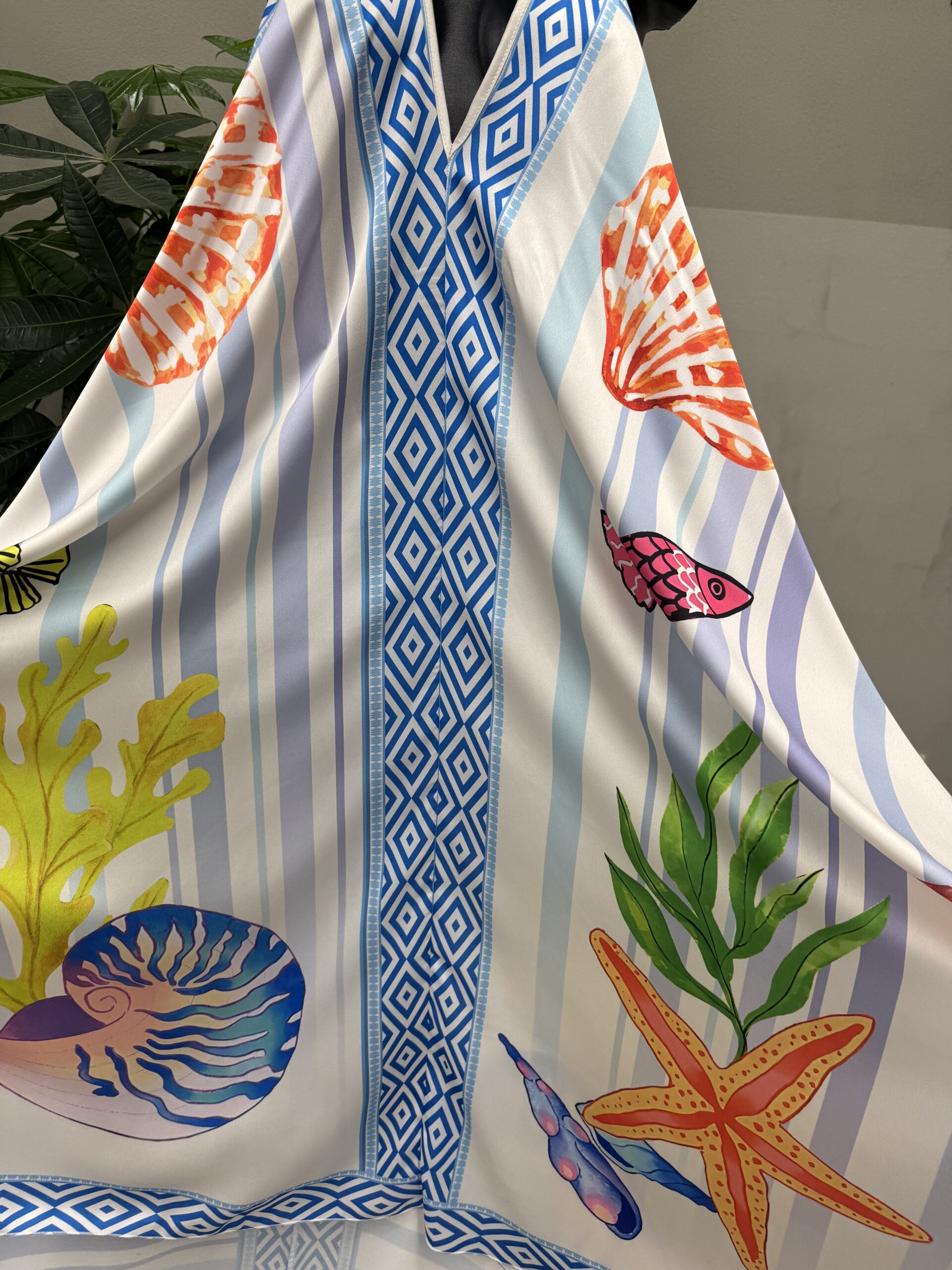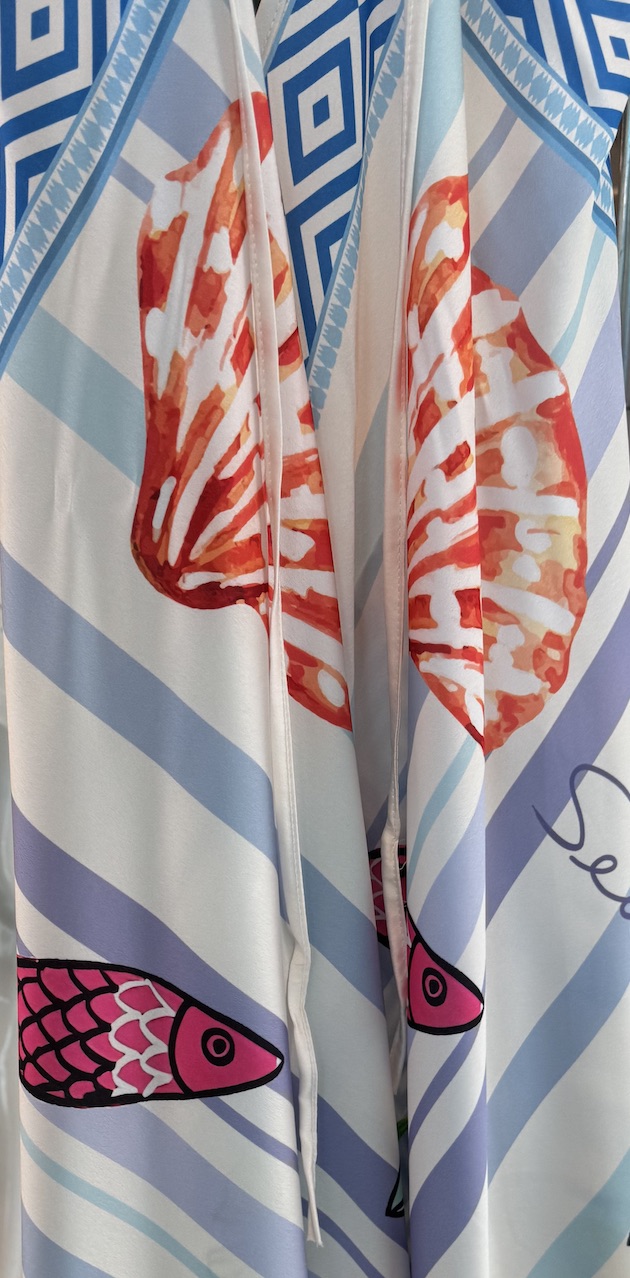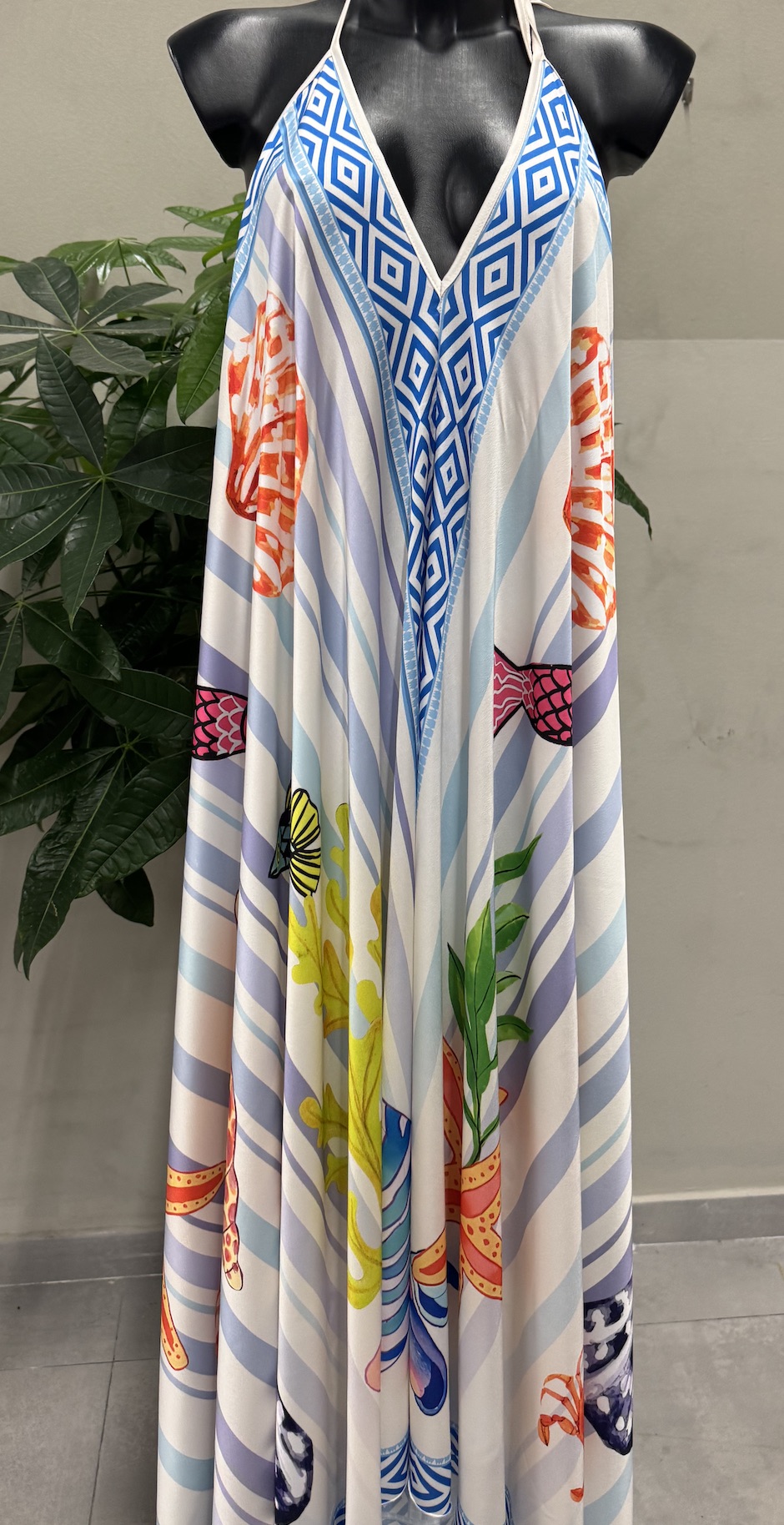This fresh and playful dress is a true highlight of the summer! It brings a Mediterranean vibe and unique charm. The open back and deep neckline subtly reveal femininity. Perfect for holidays, beach strolls, or summer parties. 100% polyester Lightweight, breathable, and soft fabric – perfect for hot summer days Style: Deep V-neckline at the front. Open back with a tie behind the neck. Flowy silhouette that creates an elegant summer look.