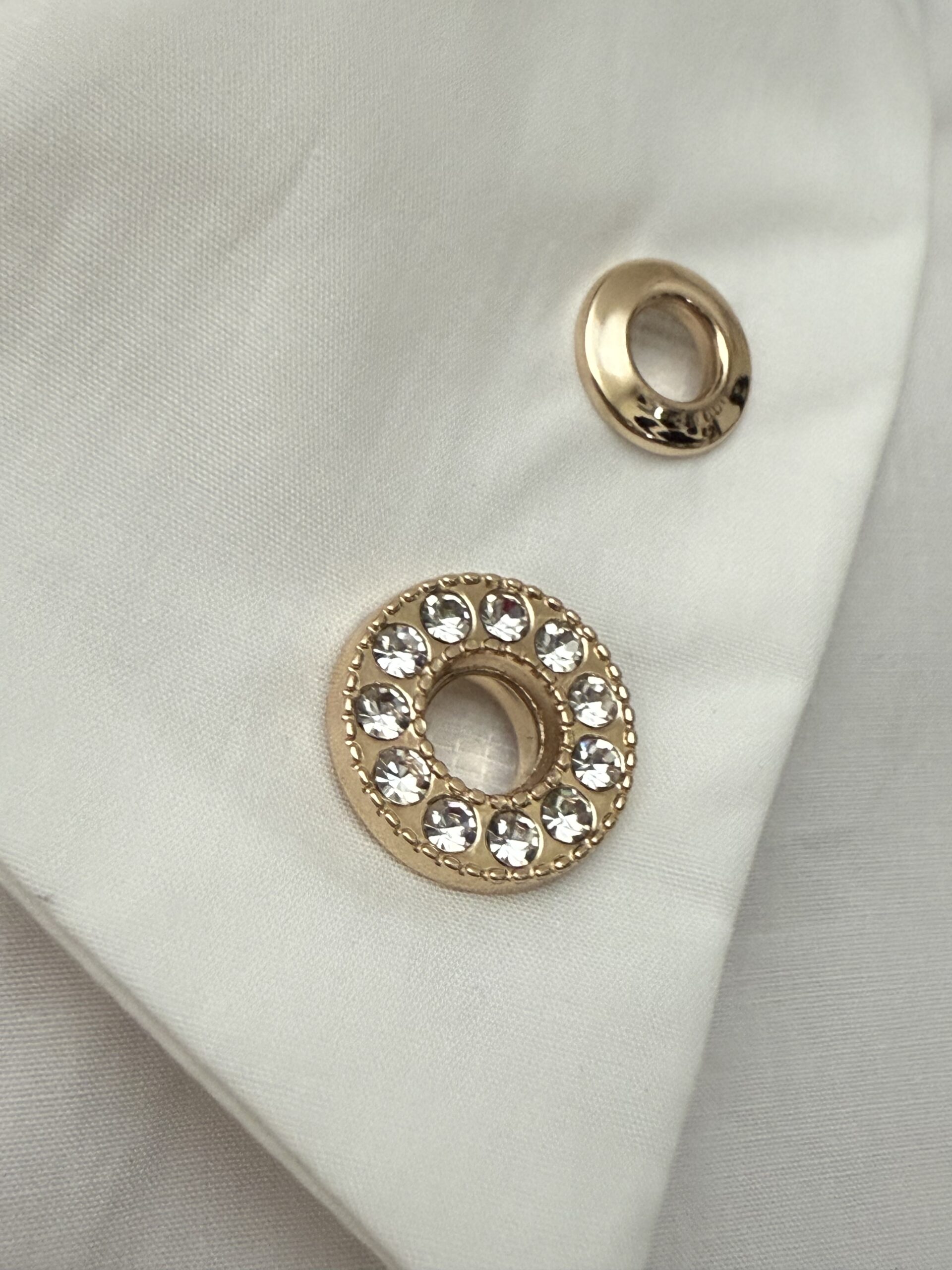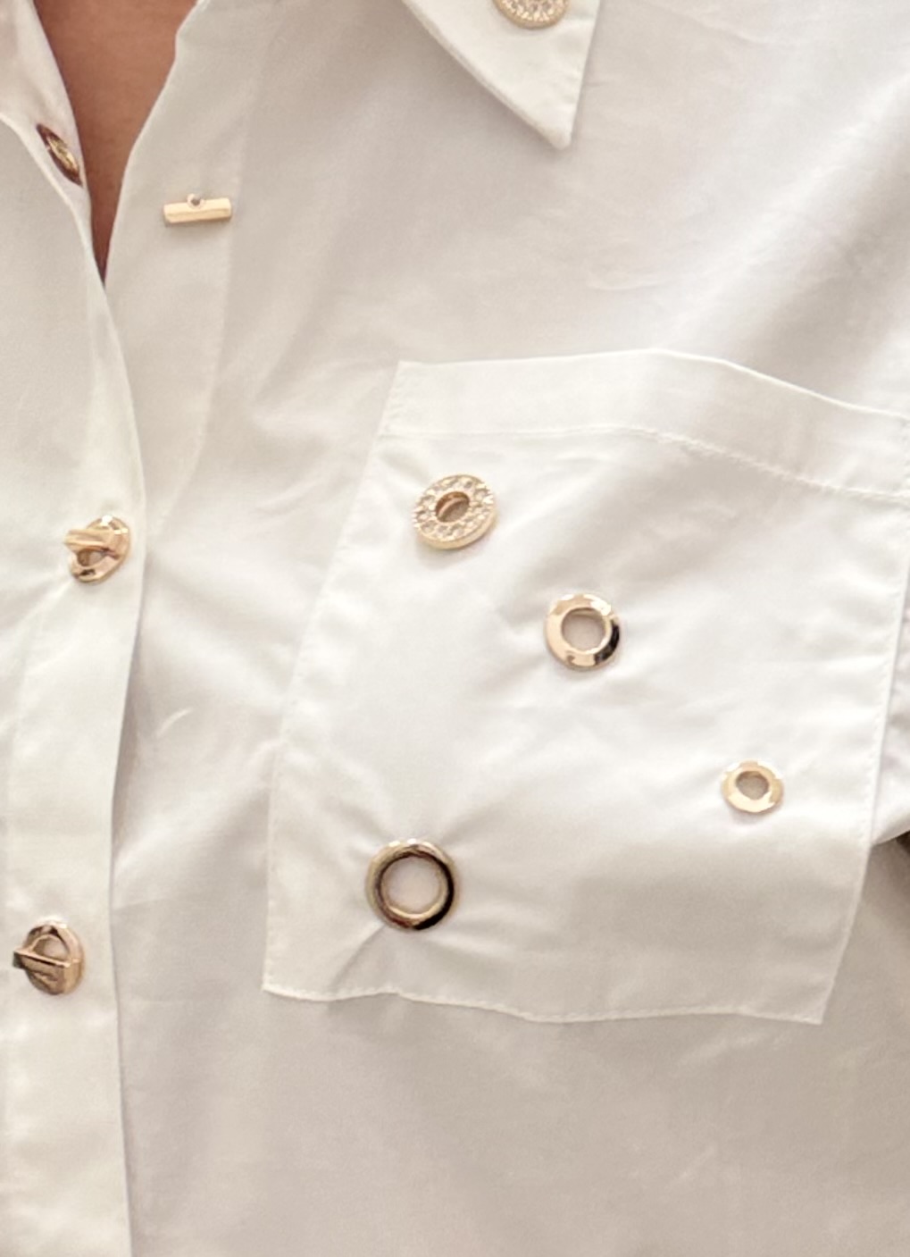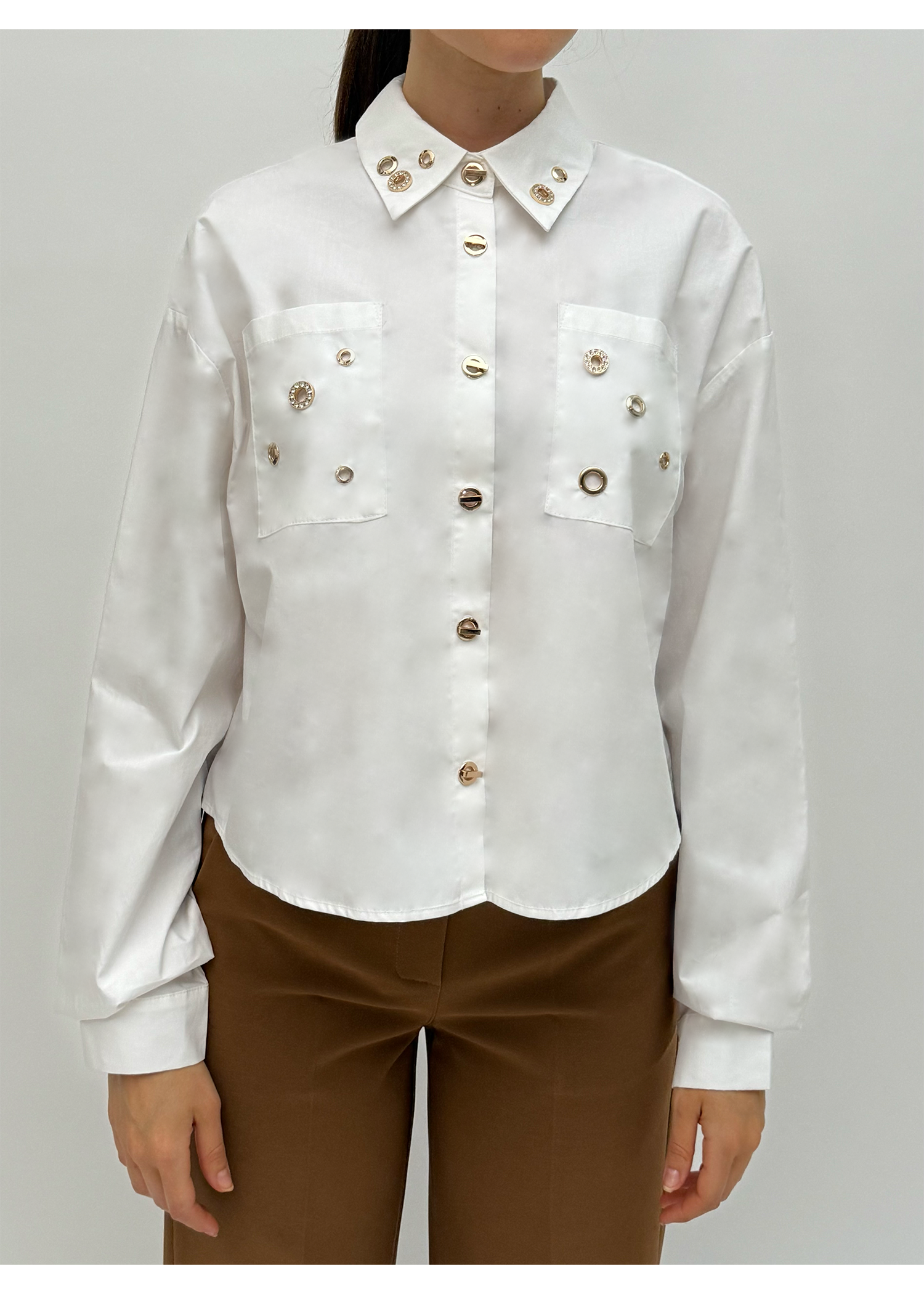 These elegant 100% cotton shirts are a standout choice for those who want to combine classic style with luxurious accents. The sparkling metal and crystal embellishments subtly enhance a modern and sophisticated look. Perfect to pair with trousers or a skirt – ideal for both office wear and chic casual outings.