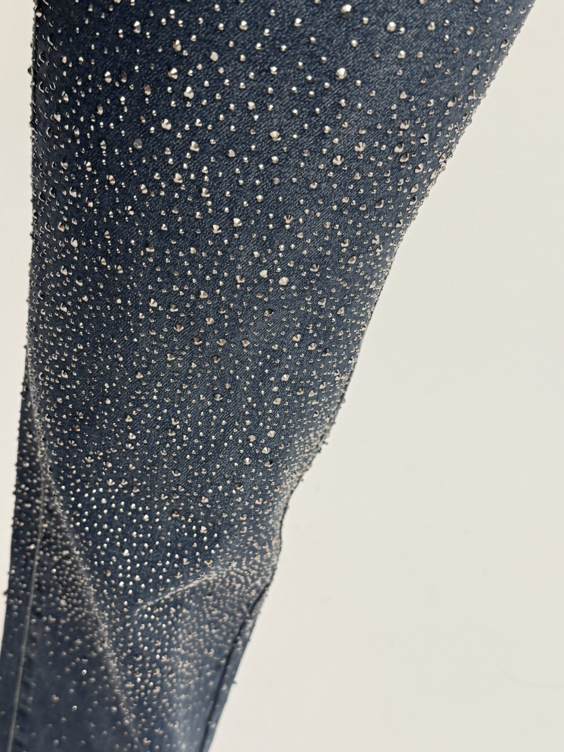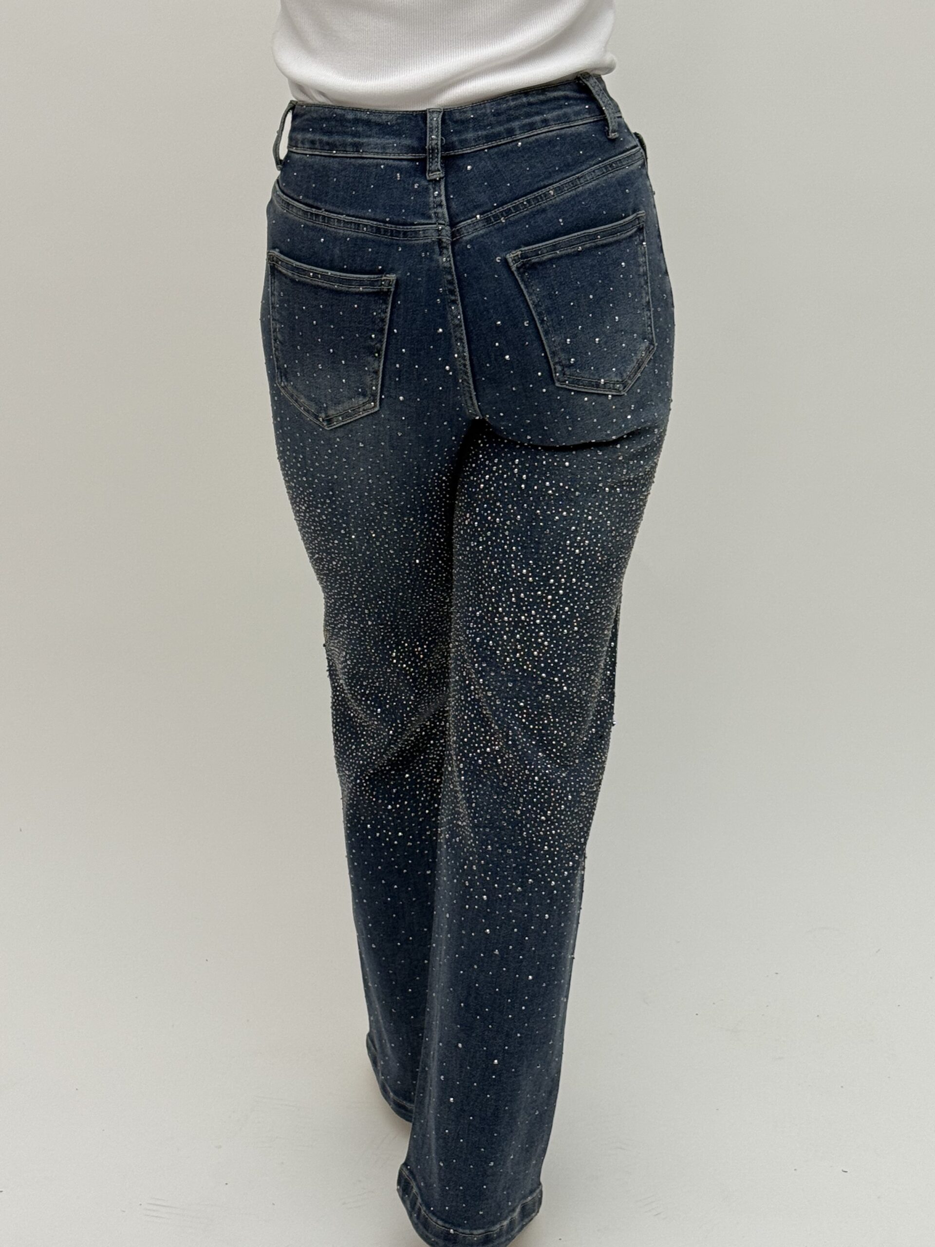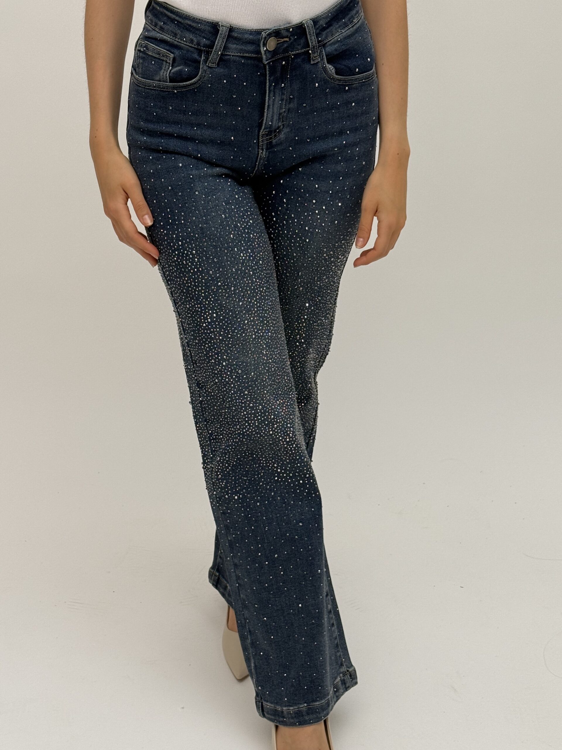 These straight-leg jeans are the perfect blend of elegance and street style. The dark blue fabric is embellished with hundreds of tiny shimmering studs that resemble crystals – catching the light as you move and adding a luxurious touch. With a high waist, comfortable fit, and versatile style, they pair effortlessly with classic heels or casual footwear.