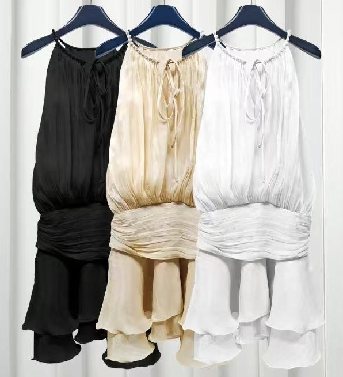 Light, airy, and effortlessly elegant — this layered chiffon mini dress is your go-to for summer parties, vacation evenings, or chic day looks. Designed with a flattering halter neckline and delicate tie detail, the dress flows into a relaxed, gathered waist and tiered ruffle hem. The pleated texture adds dimension and movement, making it both graceful and feminine.