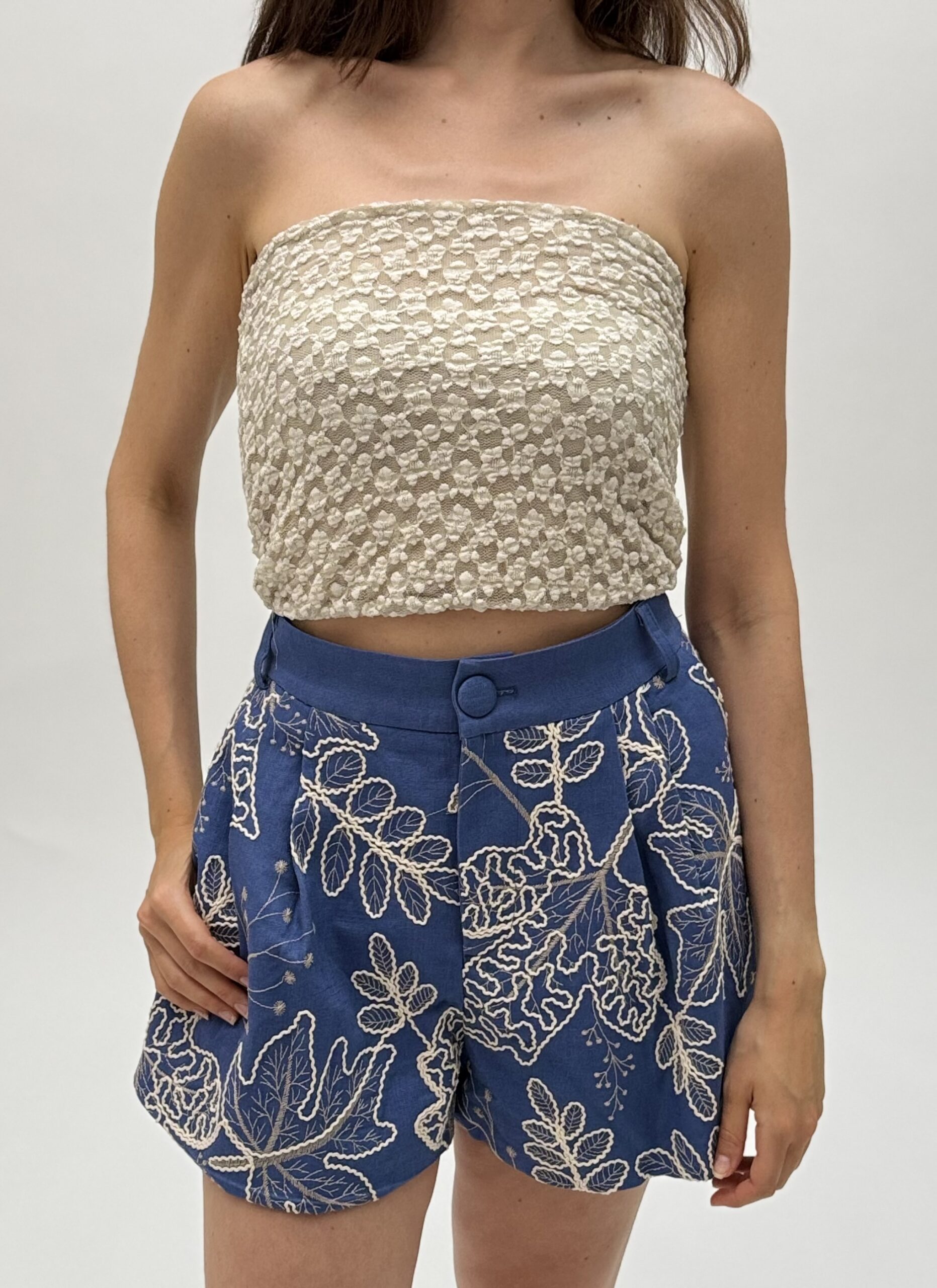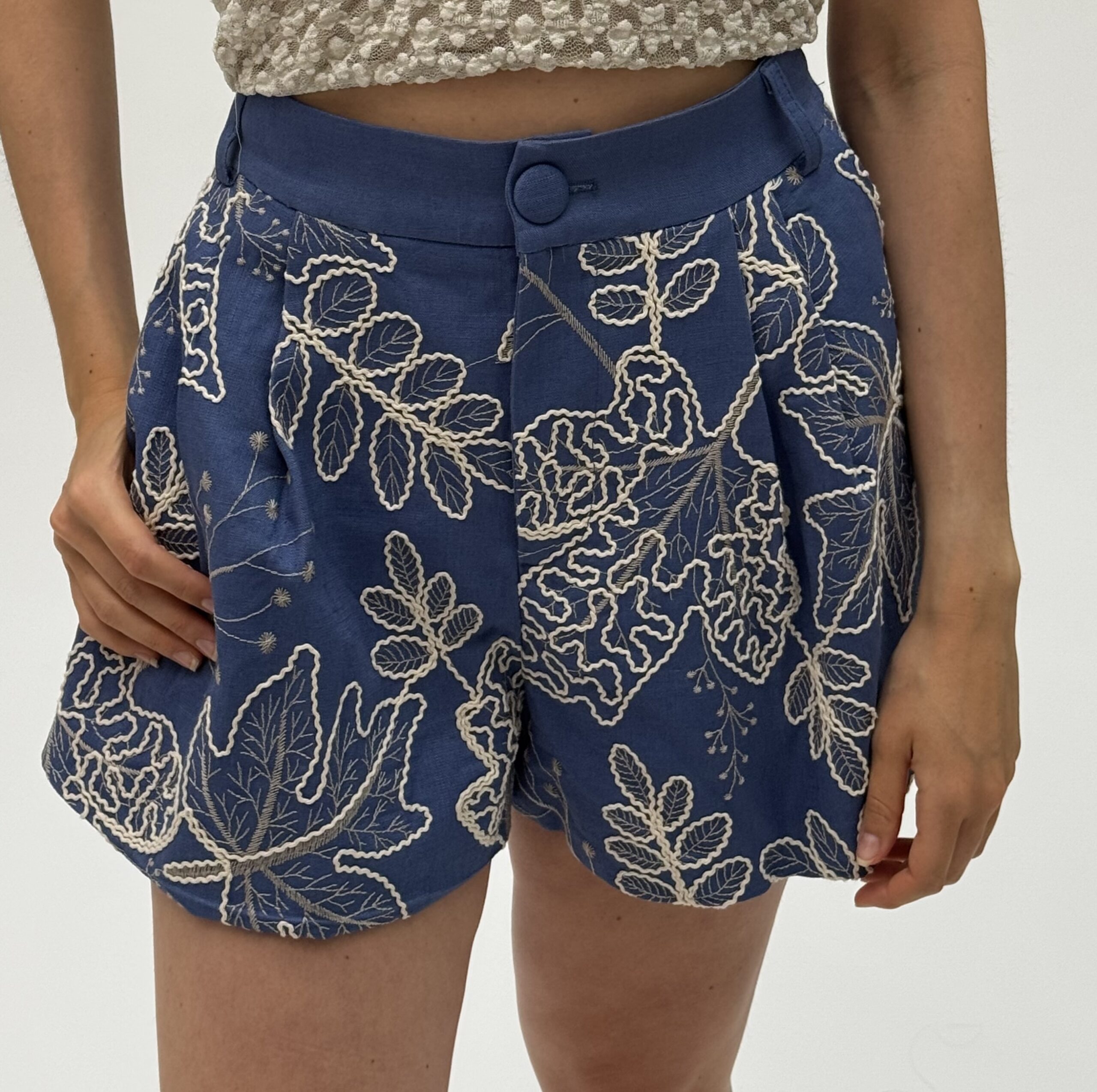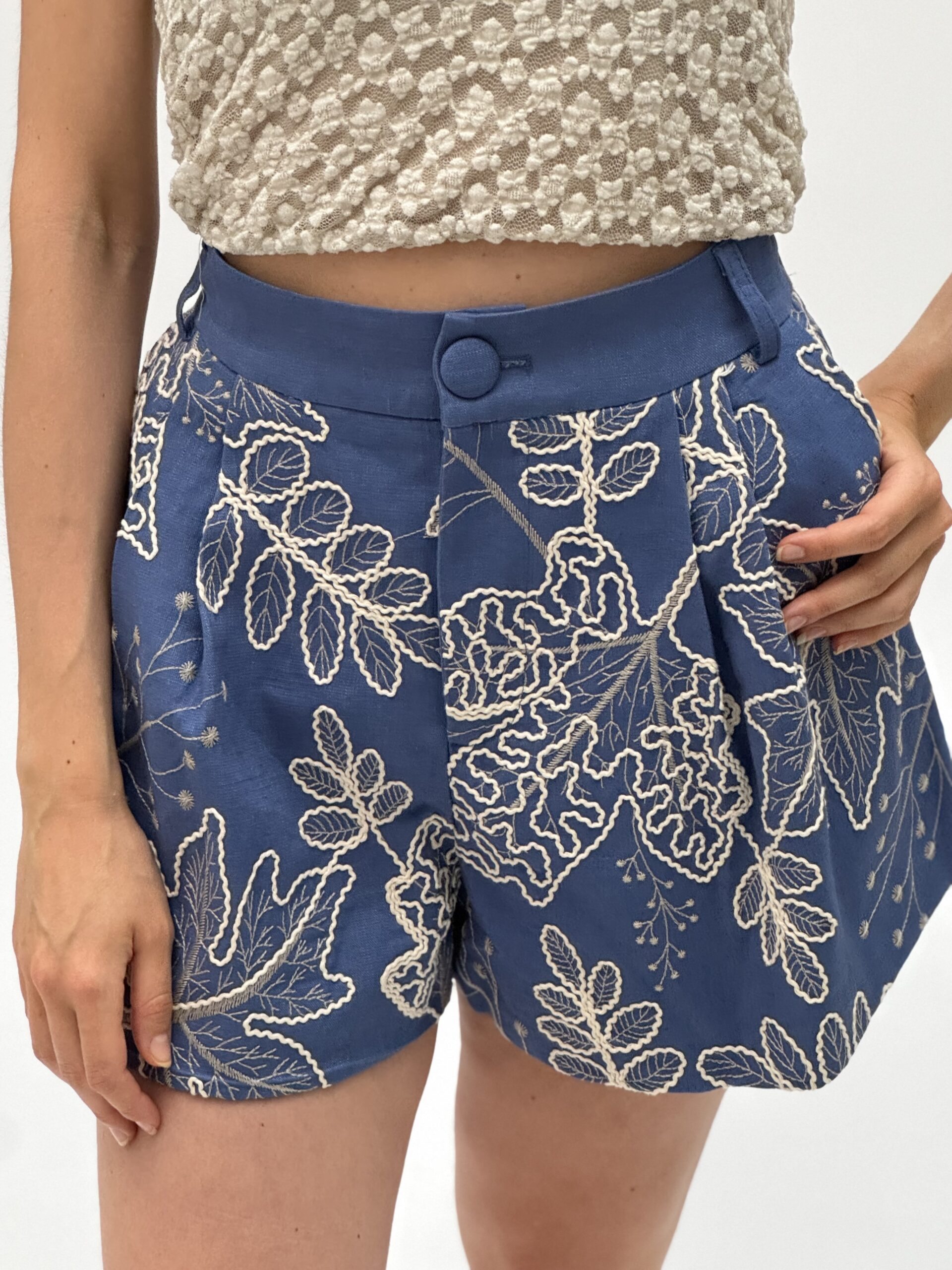 These elegant shorts are a true gem in your summer wardrobe. Featuring delicate botanical embroidery, they offer a unique touch of style with a hint of bohemian charm. The front pleats and round decorative button create a structured yet relaxed silhouette, while the hidden elastic waistband in the back ensures a comfortable and flexible fit. Made from a breathable blend of viscose and linen, they’re perfect for warm-weather days, whether strolling through the city or relaxing on vacation. Pair them with a light top or linen shirt for a fresh, effortless look.