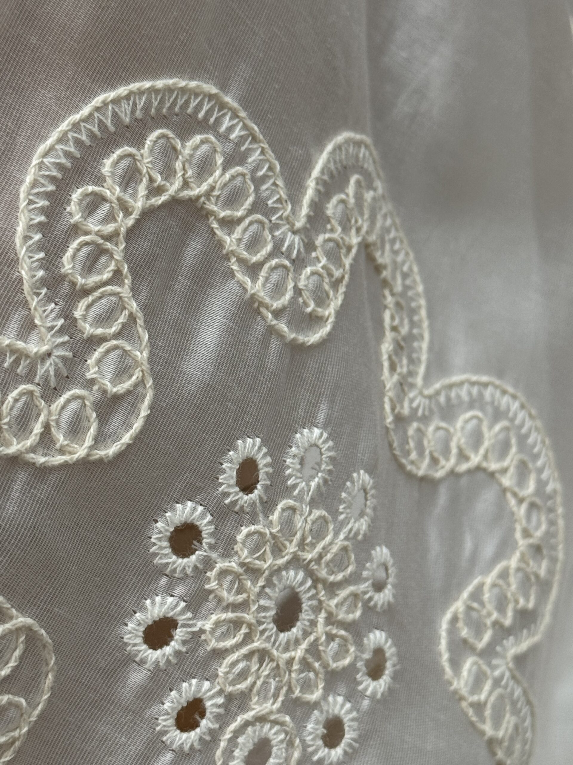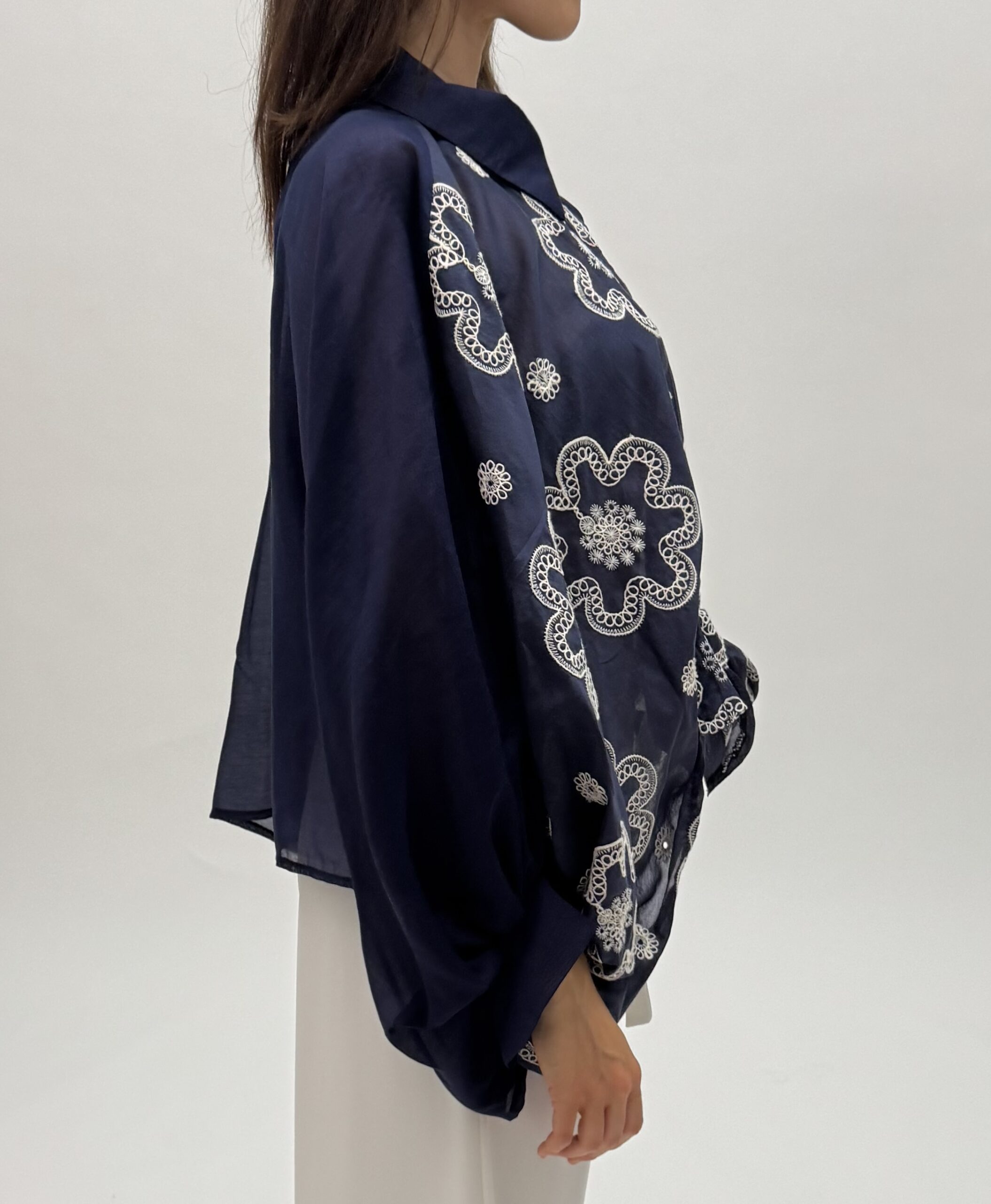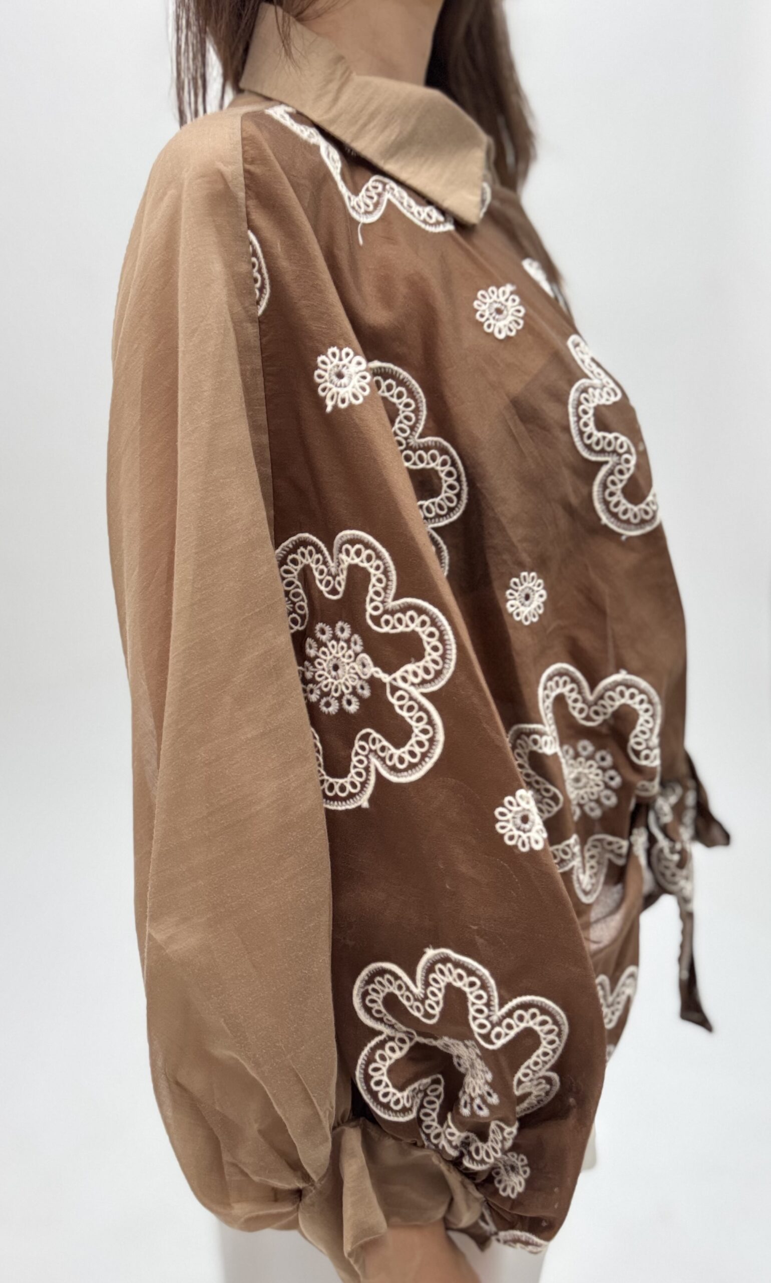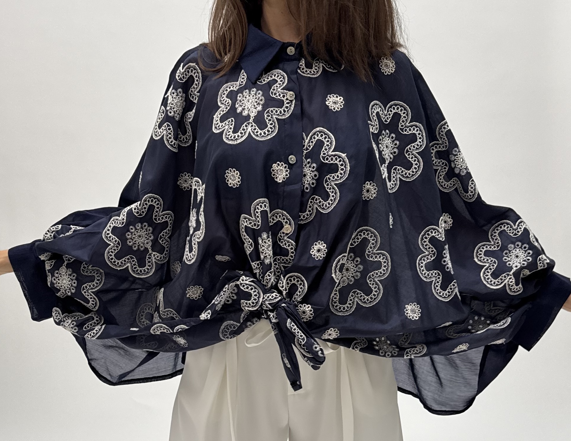 85% tencel, 15% polyester One size fits S,M,L This light and playful shirt is a true statement piece that won’t go unnoticed. Made from a semi-sheer, softly draping fabric, it’s adorned with unique floral embroidery that adds charm and character. The flowing silhouette with wide batwing sleeves and a front tie option offers both comfort and versatility – perfect with trousers, skirts, or shorts.