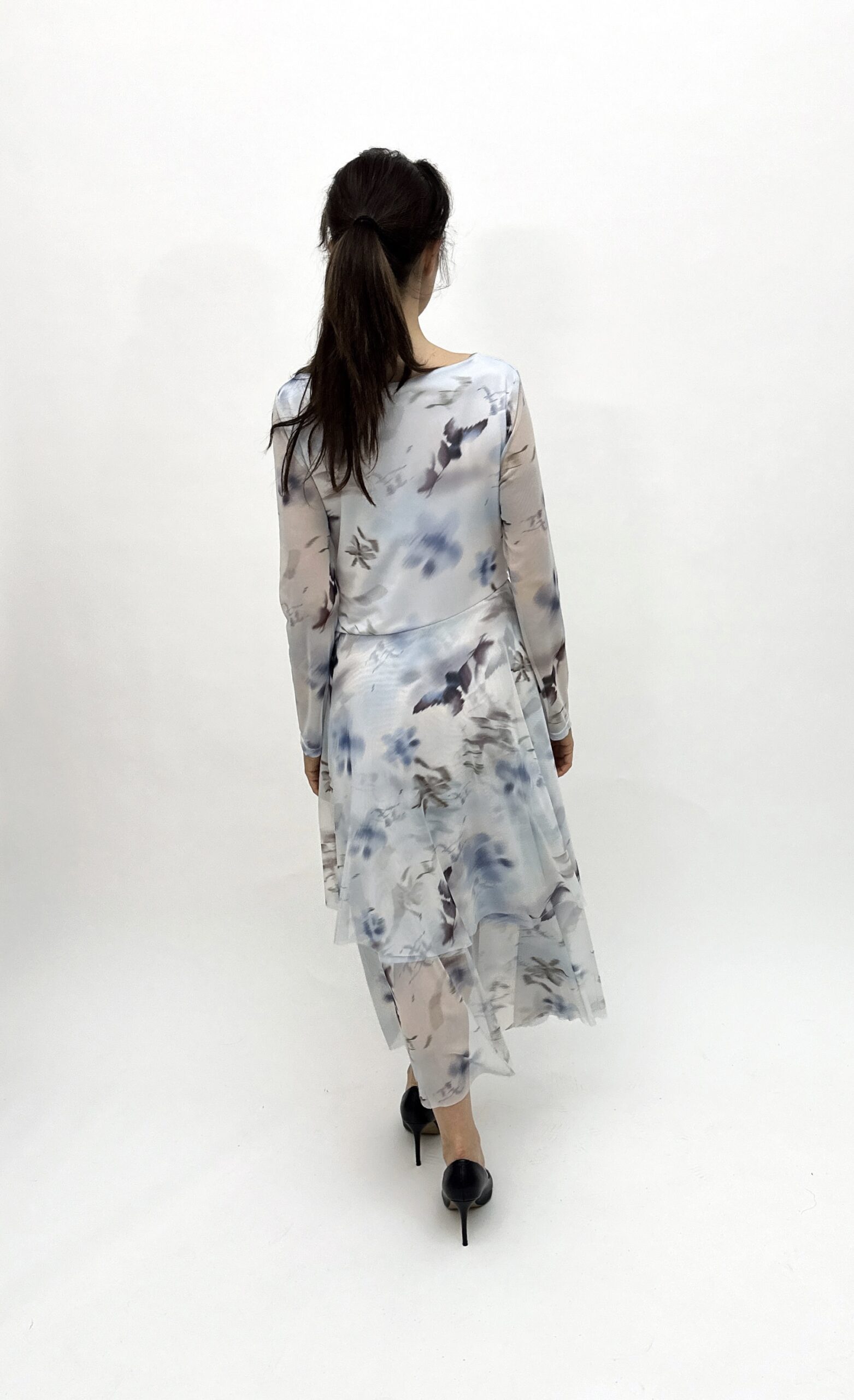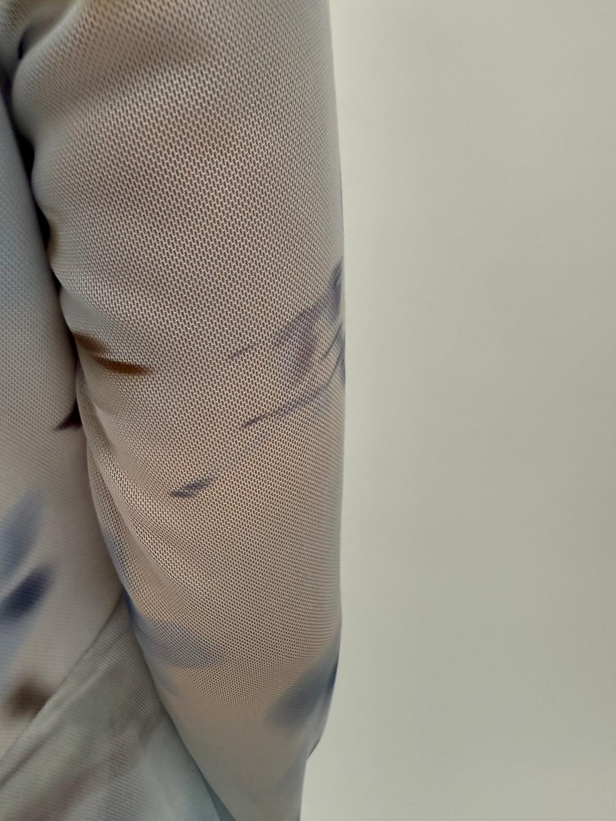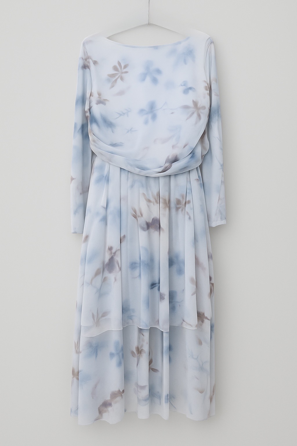 This elegant long dress is a true gem in every woman’s wardrobe. It features a light, breathable mesh fabric and a watercolor floral print that softly glows in pastel shades. The gently fitted waist flatters the figure, while the flowing layered skirt adds movement and romance. With its universally flattering design, this dress is perfect for both everyday elegance and special occasions. Long sleeves and a boat neckline add a touch of feminine softness and timeless grace.
