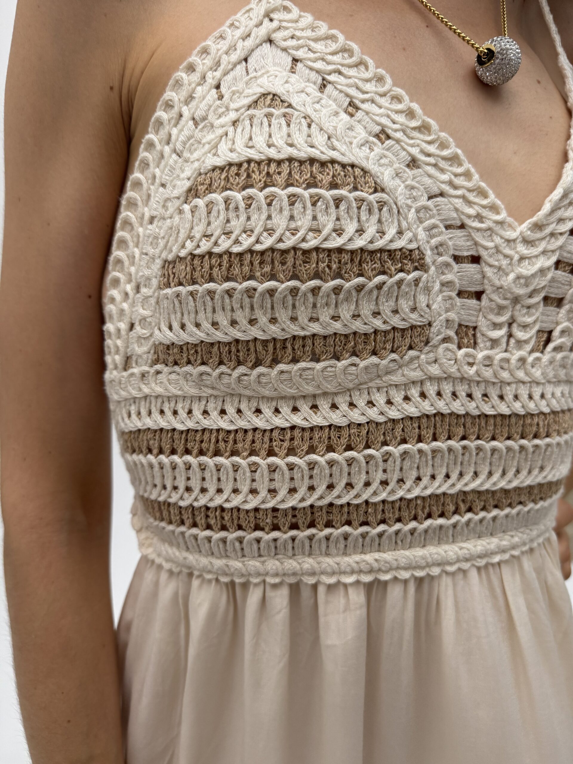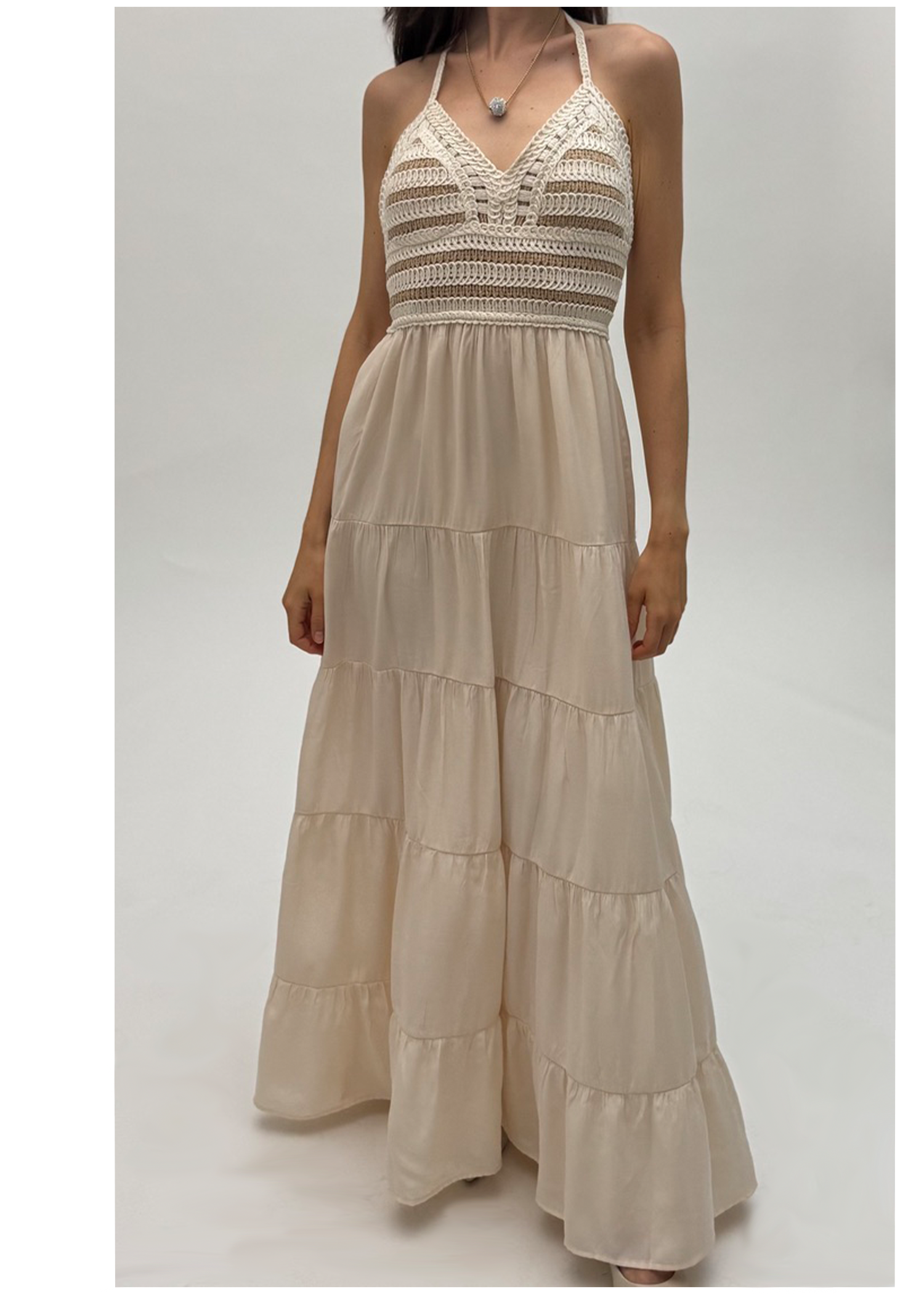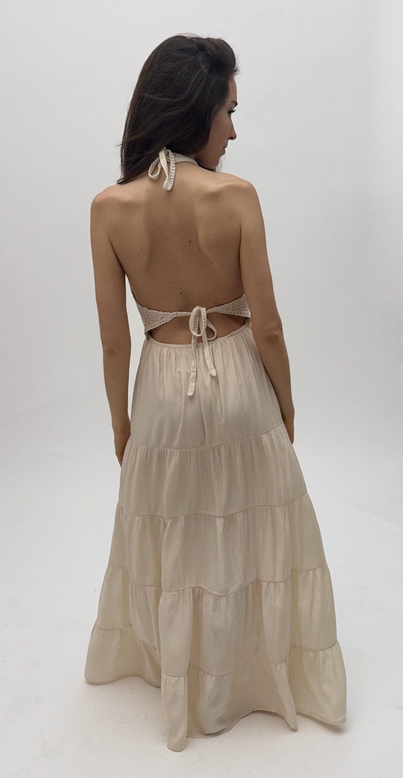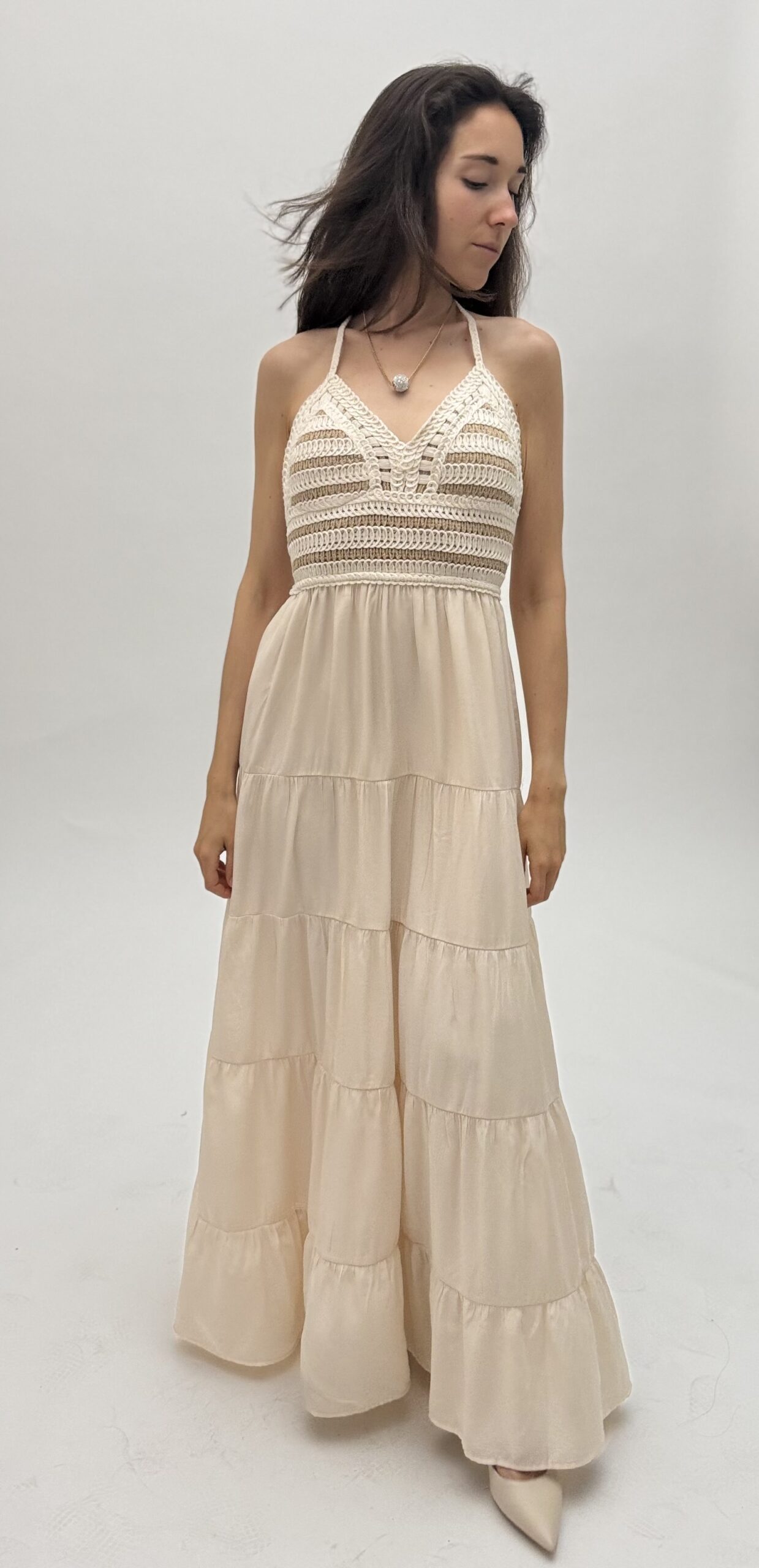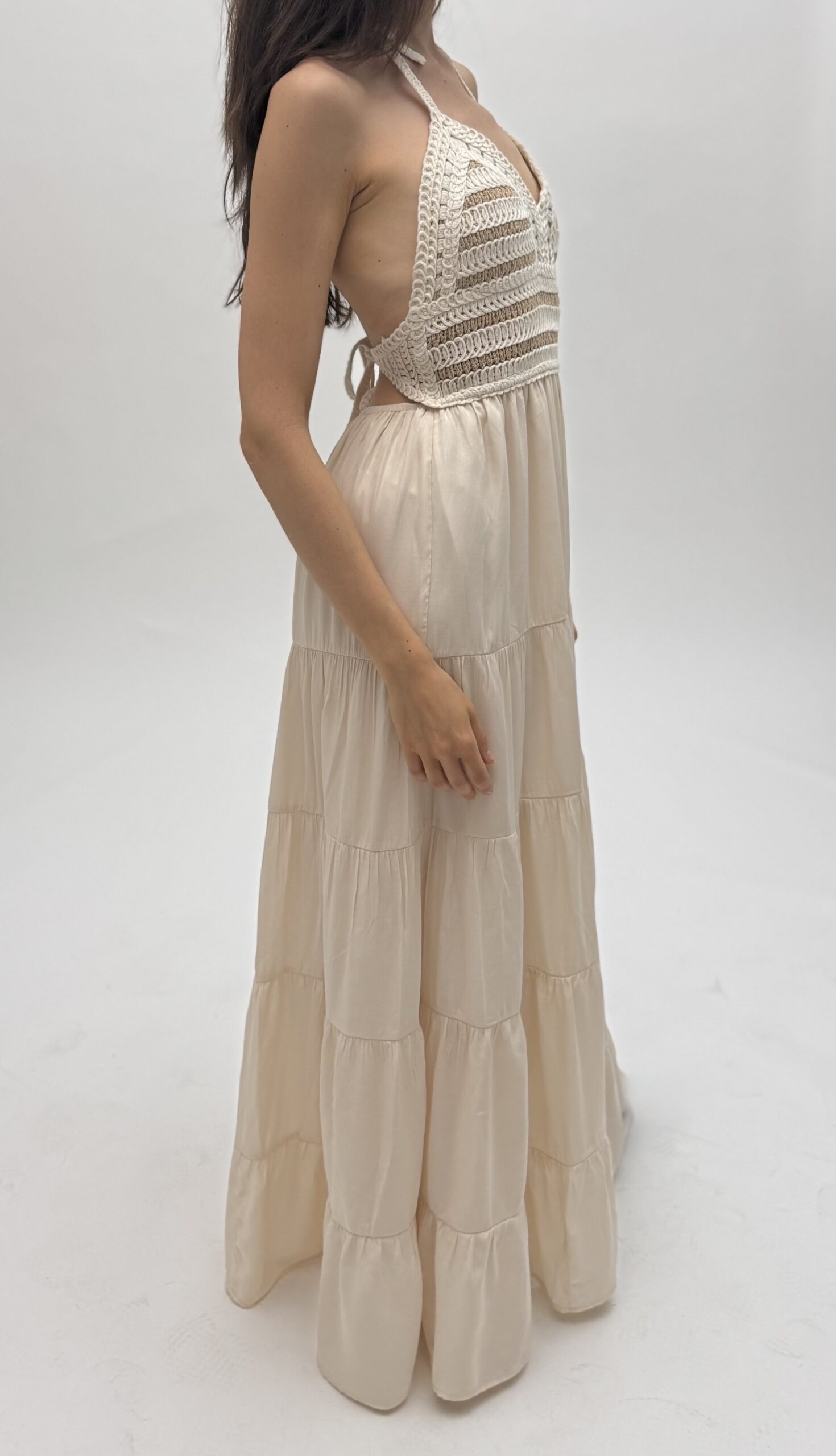 Crochet-detailed bodice Halter neck ties Flowing tiered maxi skirt Ideal for holidays, garden parties, or summer nights