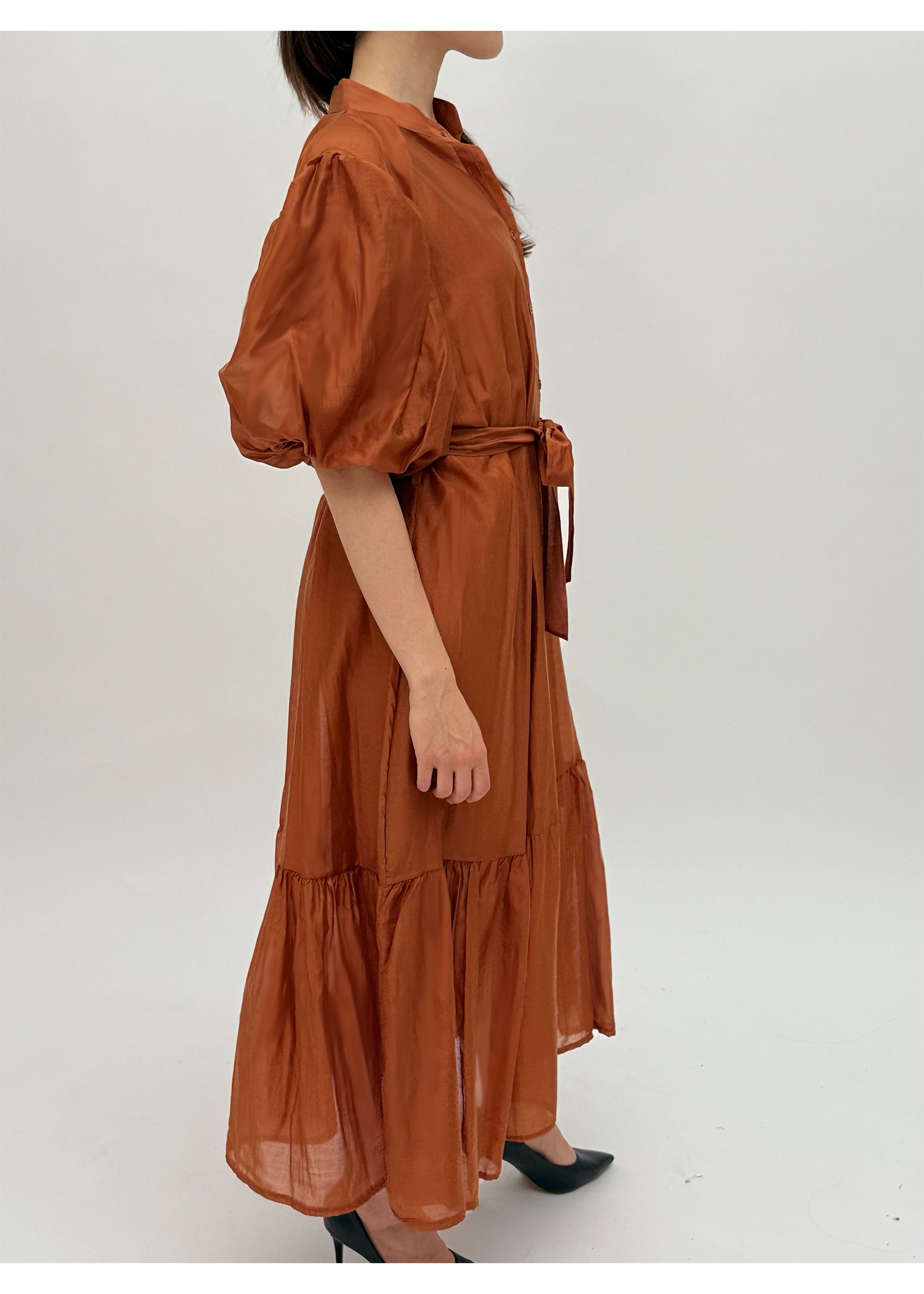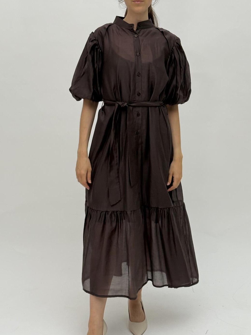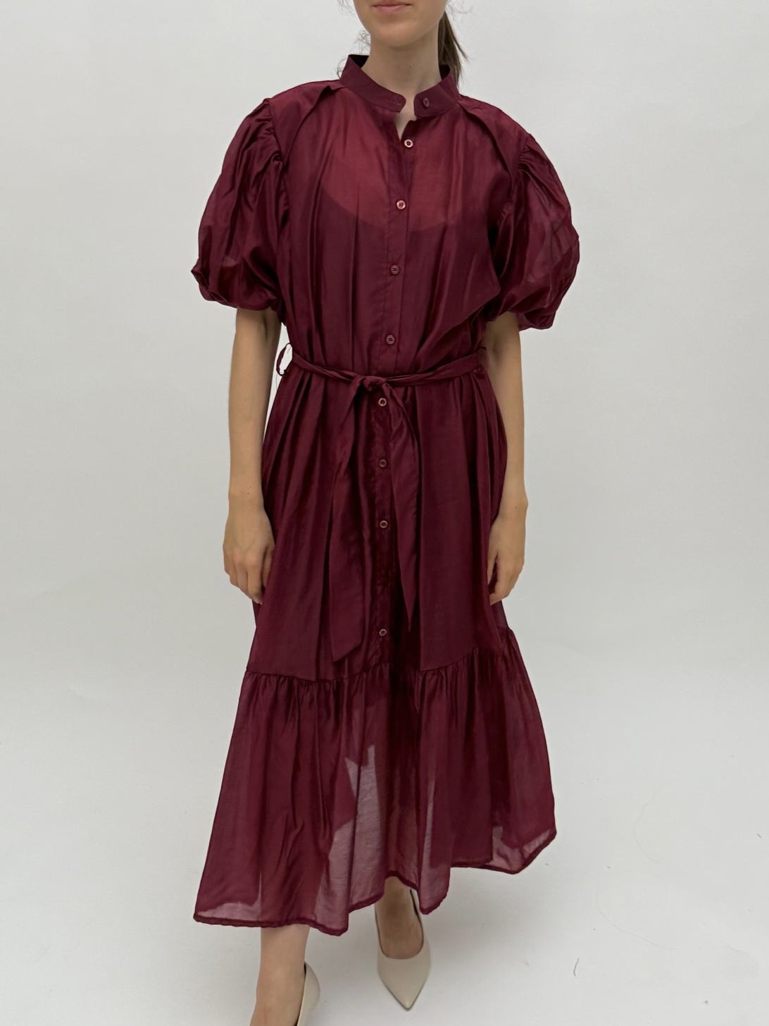 A refined blend of volume and structure, this burgundy shirt dress is crafted from a lightweight, semi-sheer fabric that moves effortlessly with the body. Designed with voluminous puff sleeves and a tiered midi skirt, it features a button-down front and a mandarin collar for a polished finish. The detachable waist tie allows you to cinch the waist for a flattering silhouette or wear it loose for a relaxed feel.