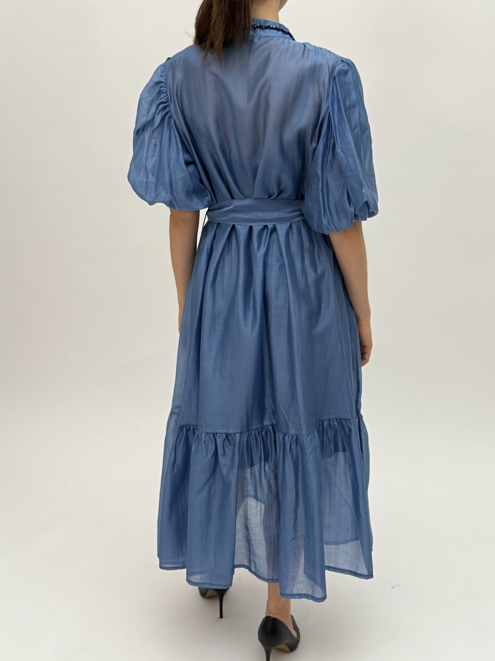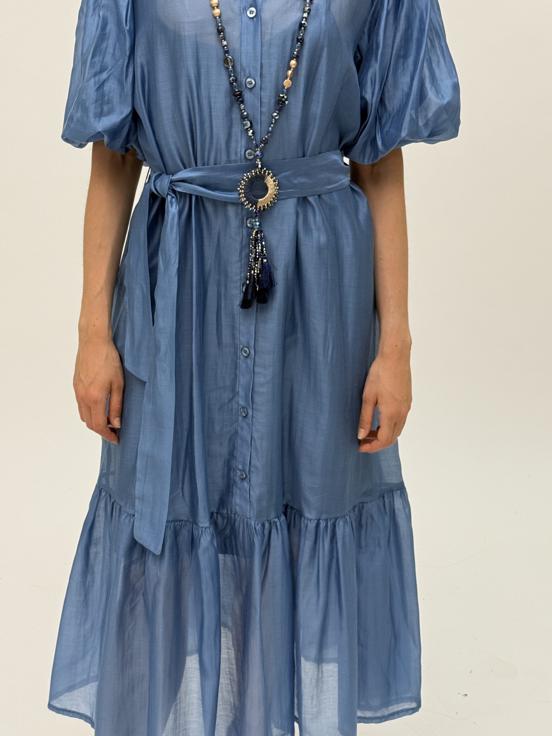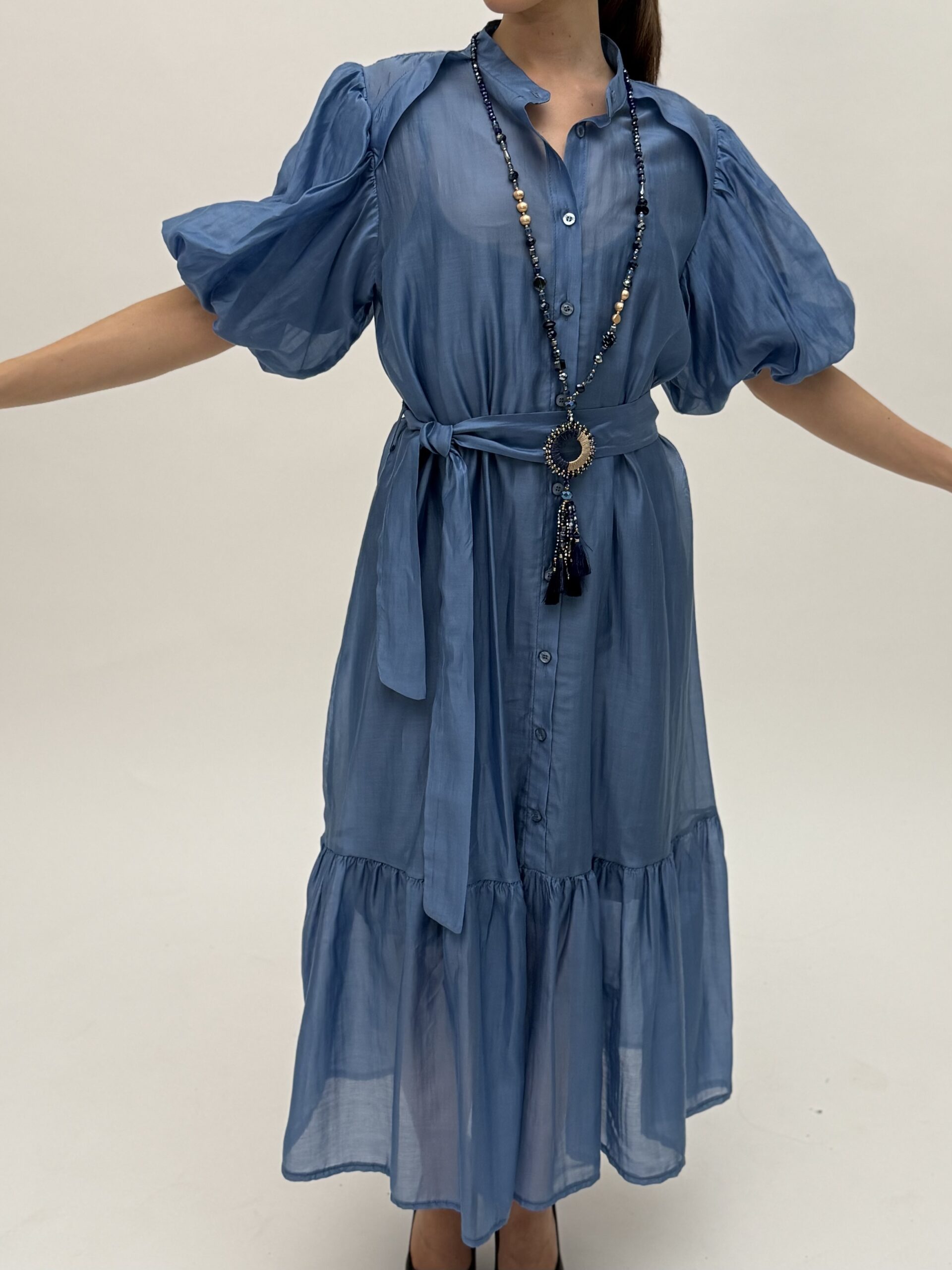 A refined blend of volume and structure, this burgundy shirt dress is crafted from a lightweight, semi-sheer fabric that moves effortlessly with the body. Designed with voluminous puff sleeves and a tiered midi skirt, it features a button-down front and a mandarin collar for a polished finish. The detachable waist tie allows you to cinch the waist for a flattering silhouette or wear it loose for a relaxed feel.