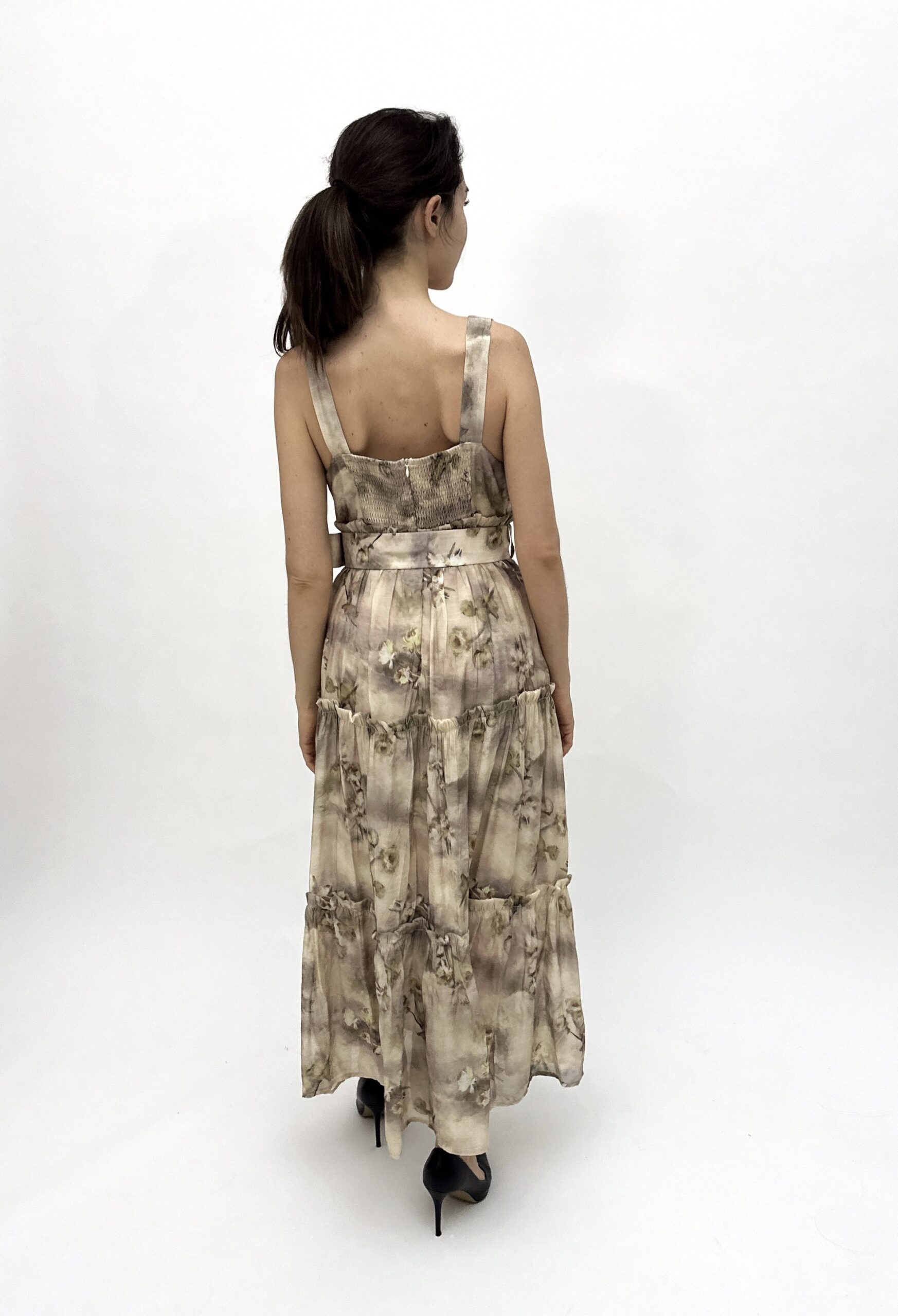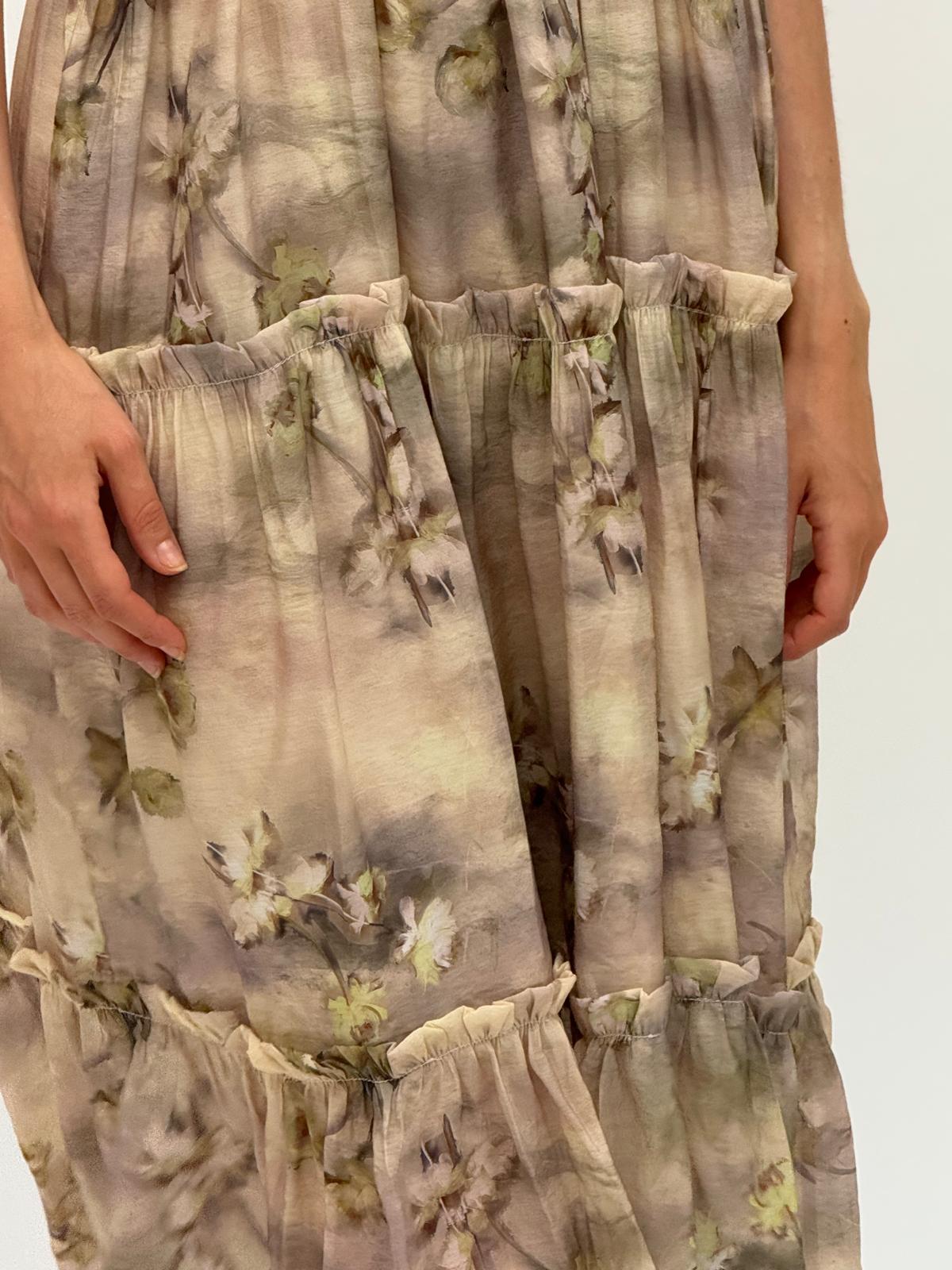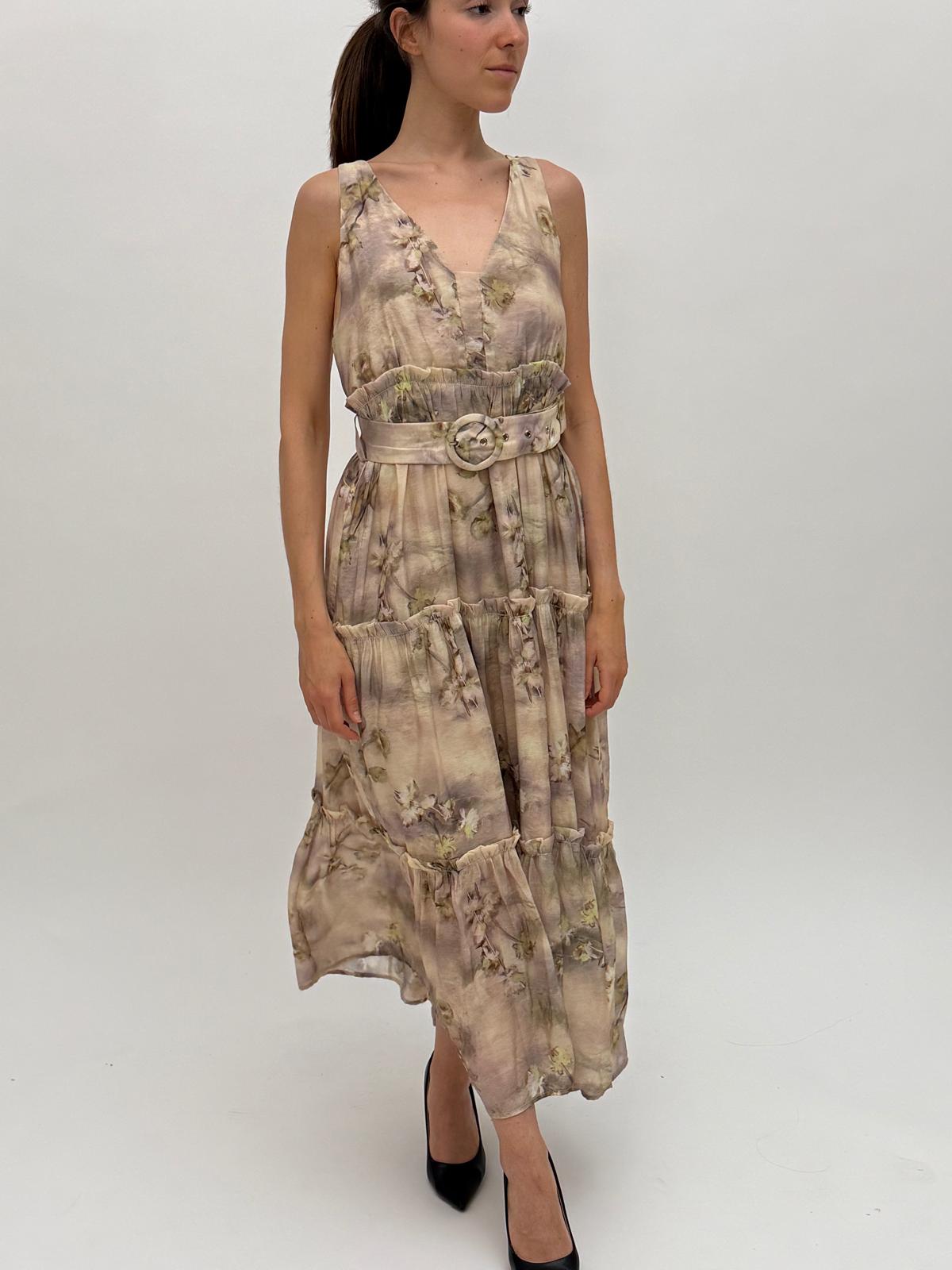 This long summer dress embodies femininity and natural elegance. The soft floral pattern in earthy and pastel tones creates a harmonious and calm look. The V-neckline and subtly accentuated waist with a decorative belt enhance the silhouette, while the layered skirt flows gracefully, adding charm and romantic flair. A perfect choice for vacations, garden parties, or everyday summer style.