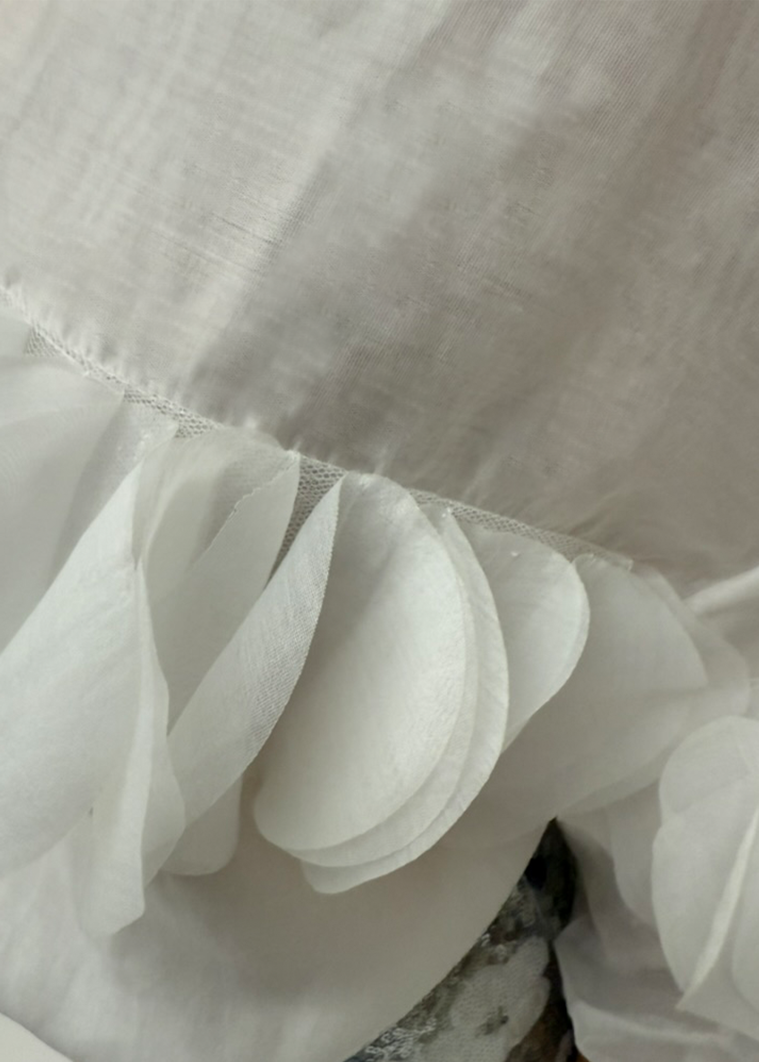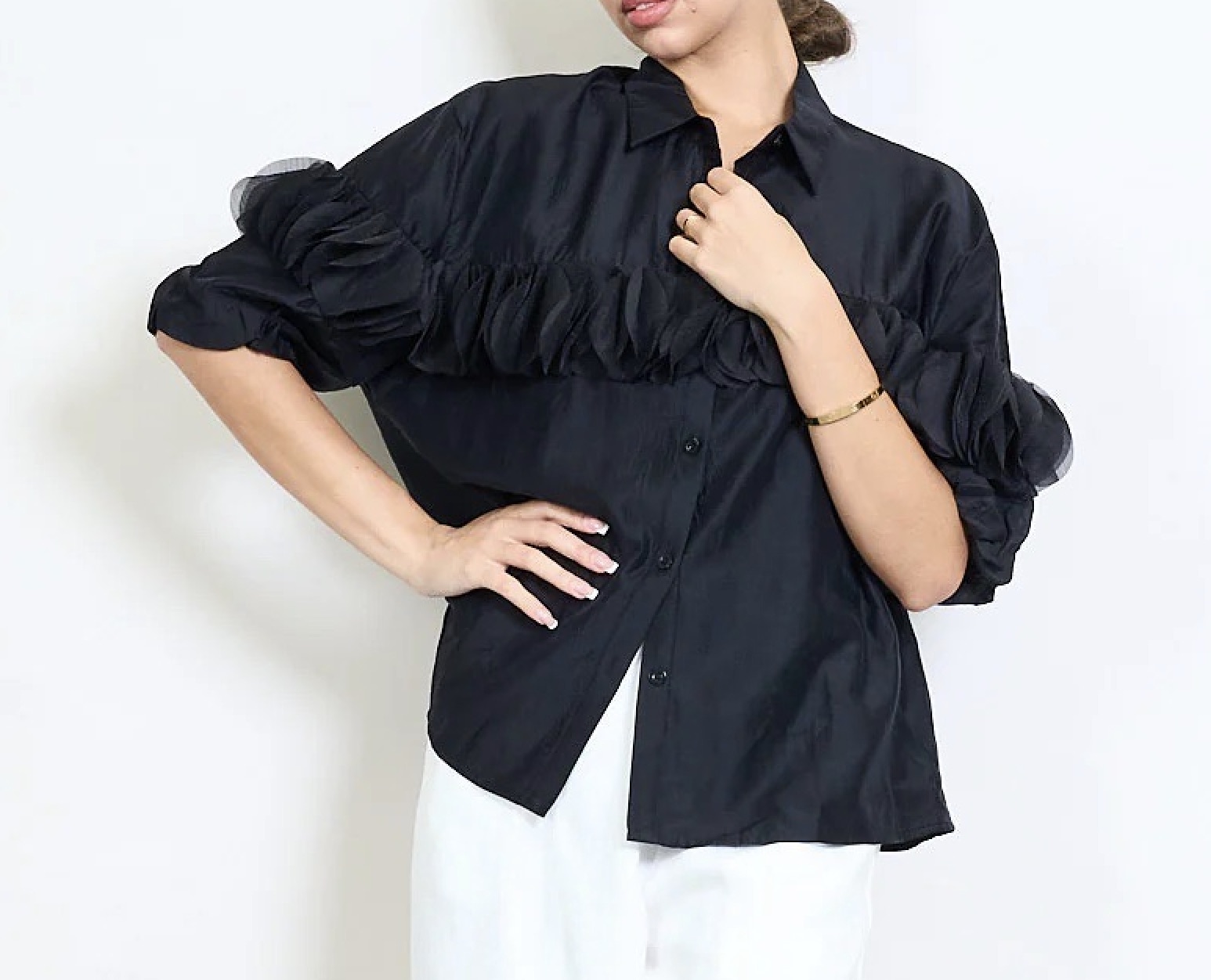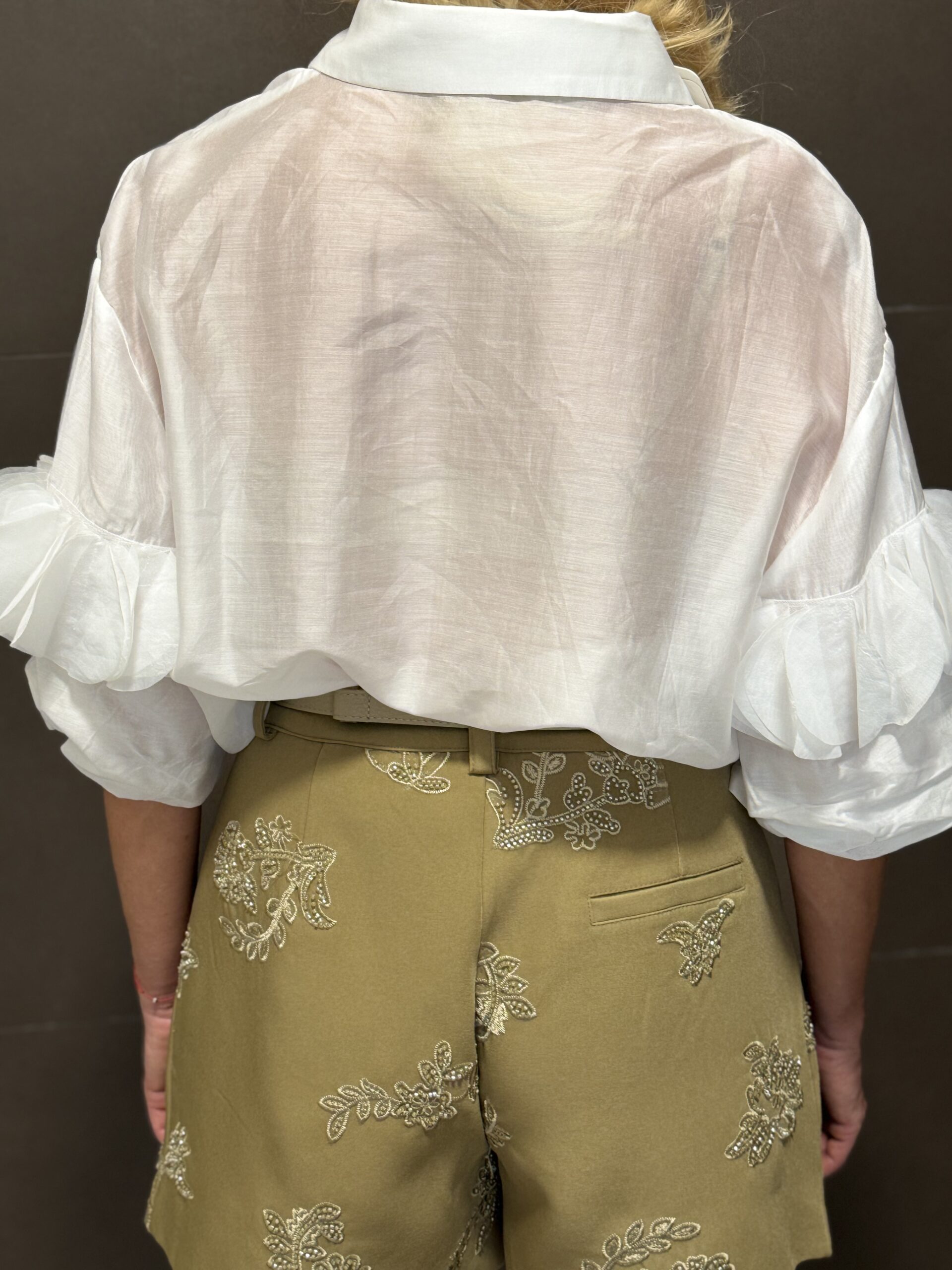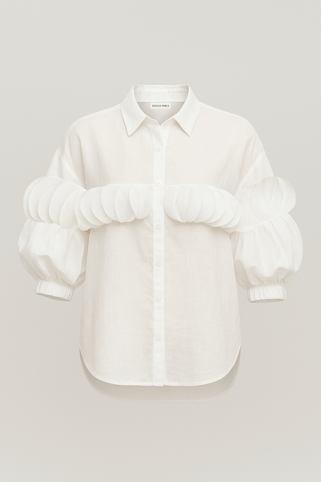 100% polyester – lightweight, soft, and non-restrictive fabric Classic short-sleeved blouse cut with a collar Extended short puffed sleeves with decorative volume Button fastening at the front One universal size   This elegant blouse enhances femininity and offers a clean, modern look. The classic collar and loose silhouette make it suitable for both everyday and evening wear. The puffed sleeves add a touch of romance, while the neutral colors make it easy to pair with various bottoms – from classic trousers to jeans or skirts.