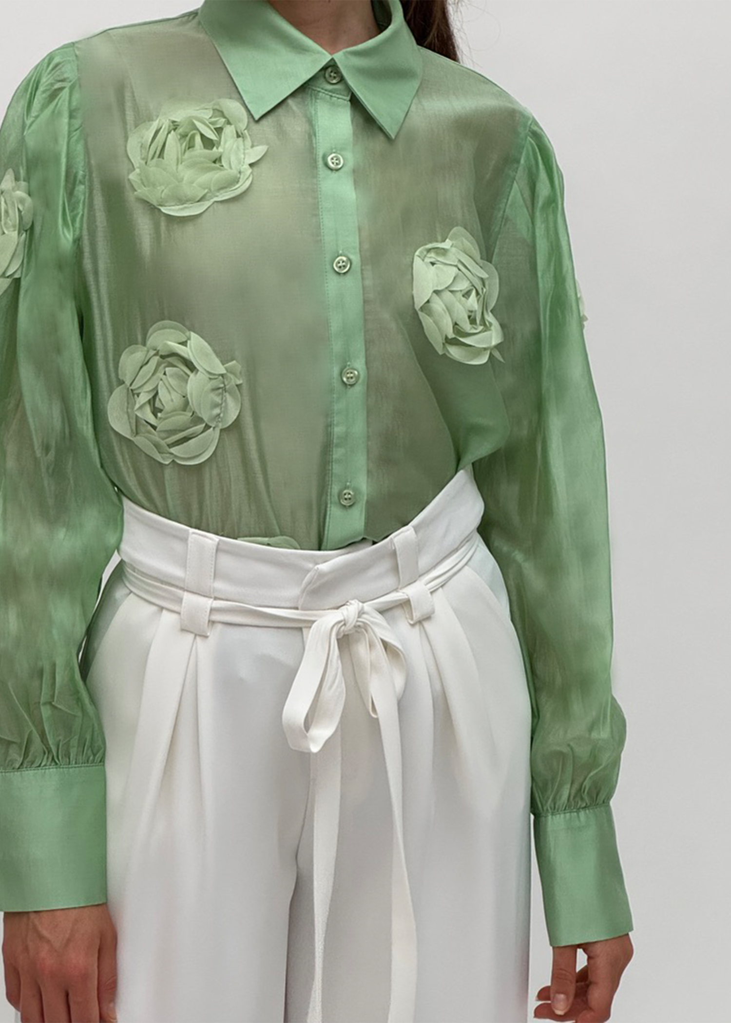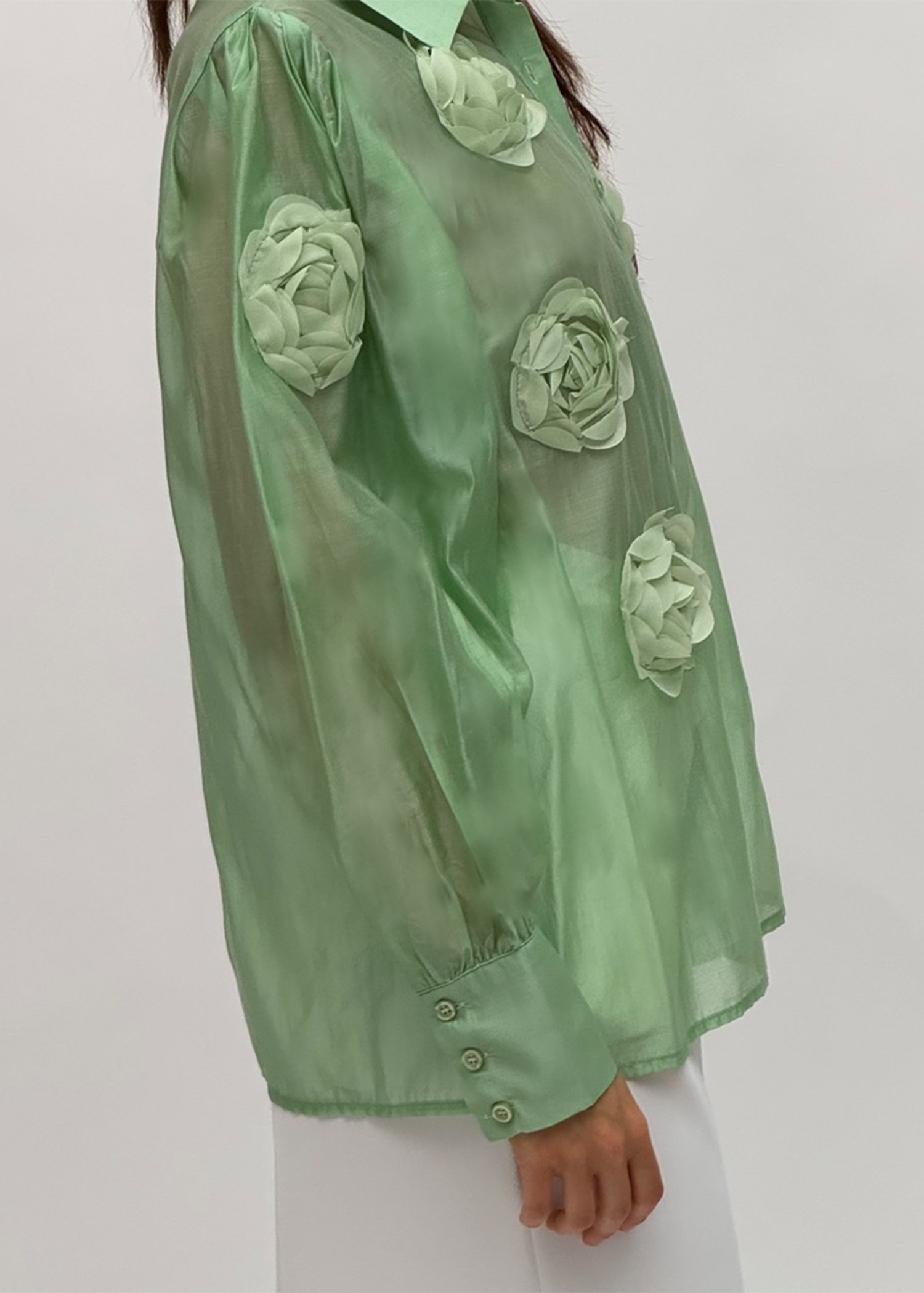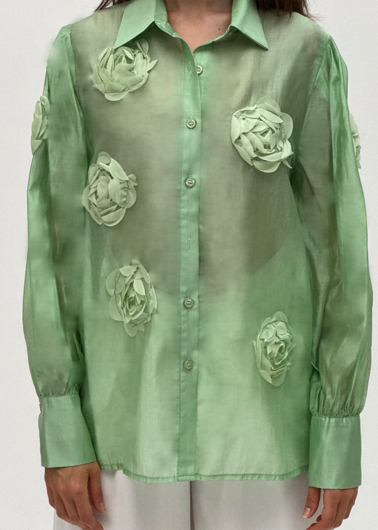 This elegant blouse shines with a subtle luxurious sheen and features decorative floral embroidery adorned with shimmering sequins. The semi-sheer, softly draping fabric allows the skin to breathe and offers a lightweight feel, while the classic button-up silhouette pairs perfectly with both formal and evening outfits.