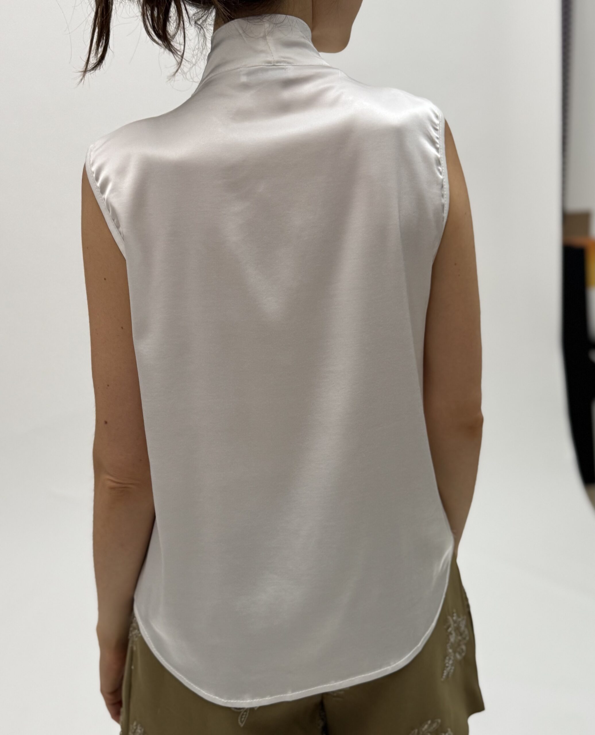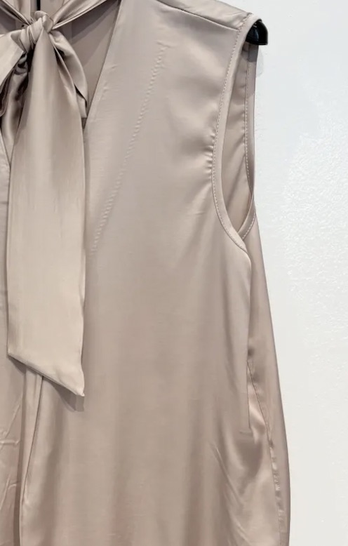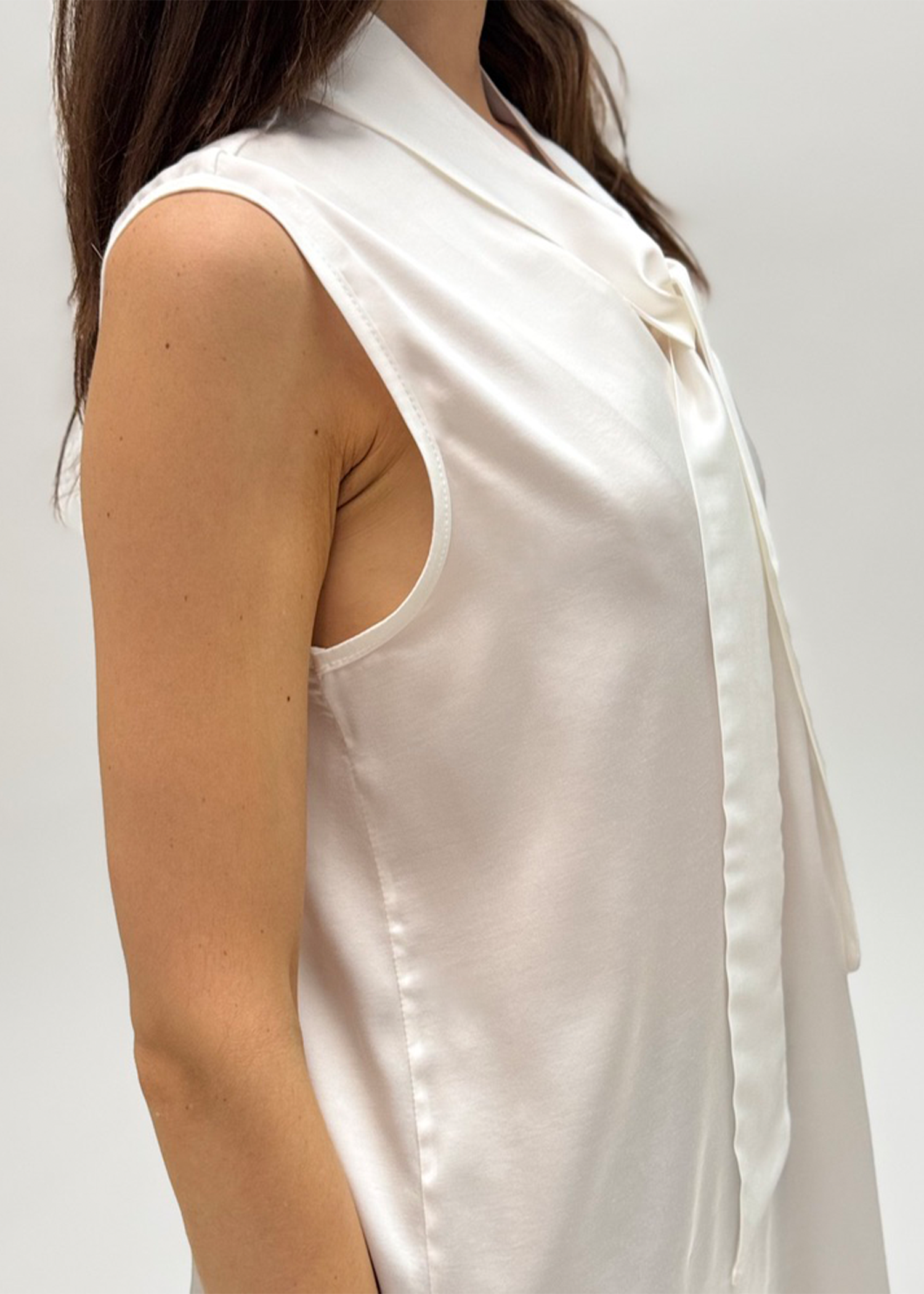 This sleeveless blouse with a graceful tie-neck detail is an elegant and versatile piece – perfect for the office or a refined occasion. Made from a soft, breathable EcoVero-viscose blend, the fabric has a subtle satin-like shine and feels luxurious against the skin. The necktie can be styled in a bow or left loose for a more effortless look.