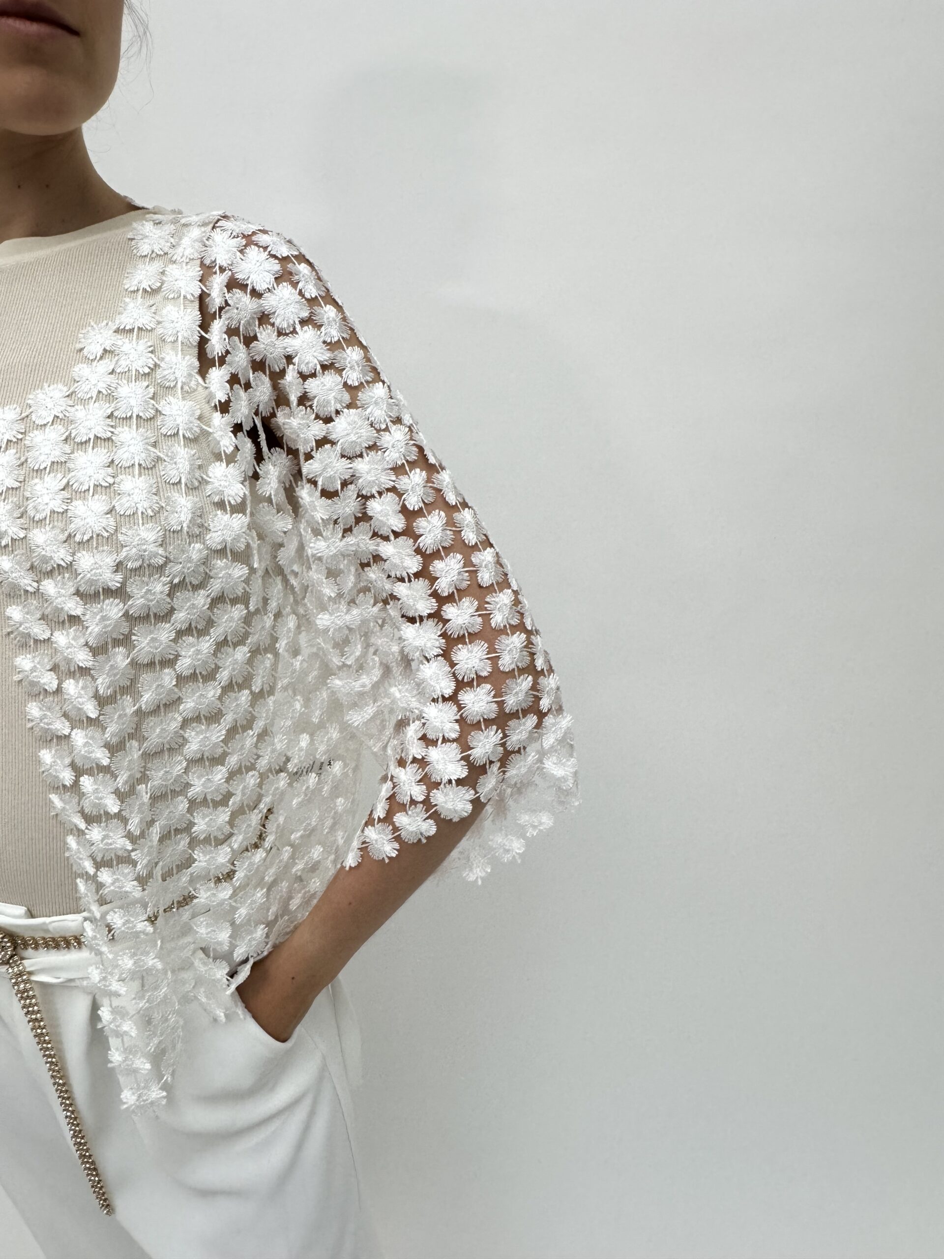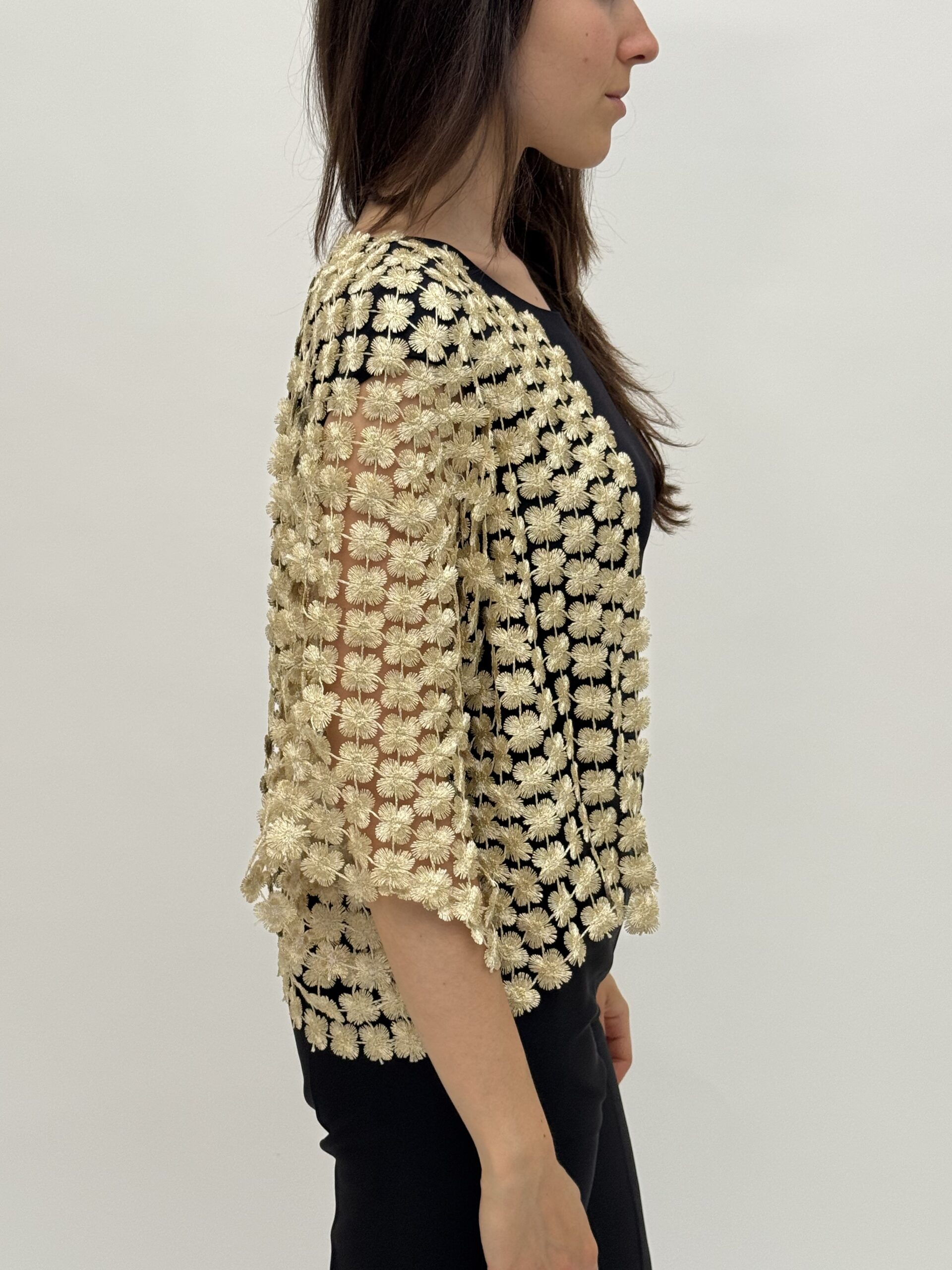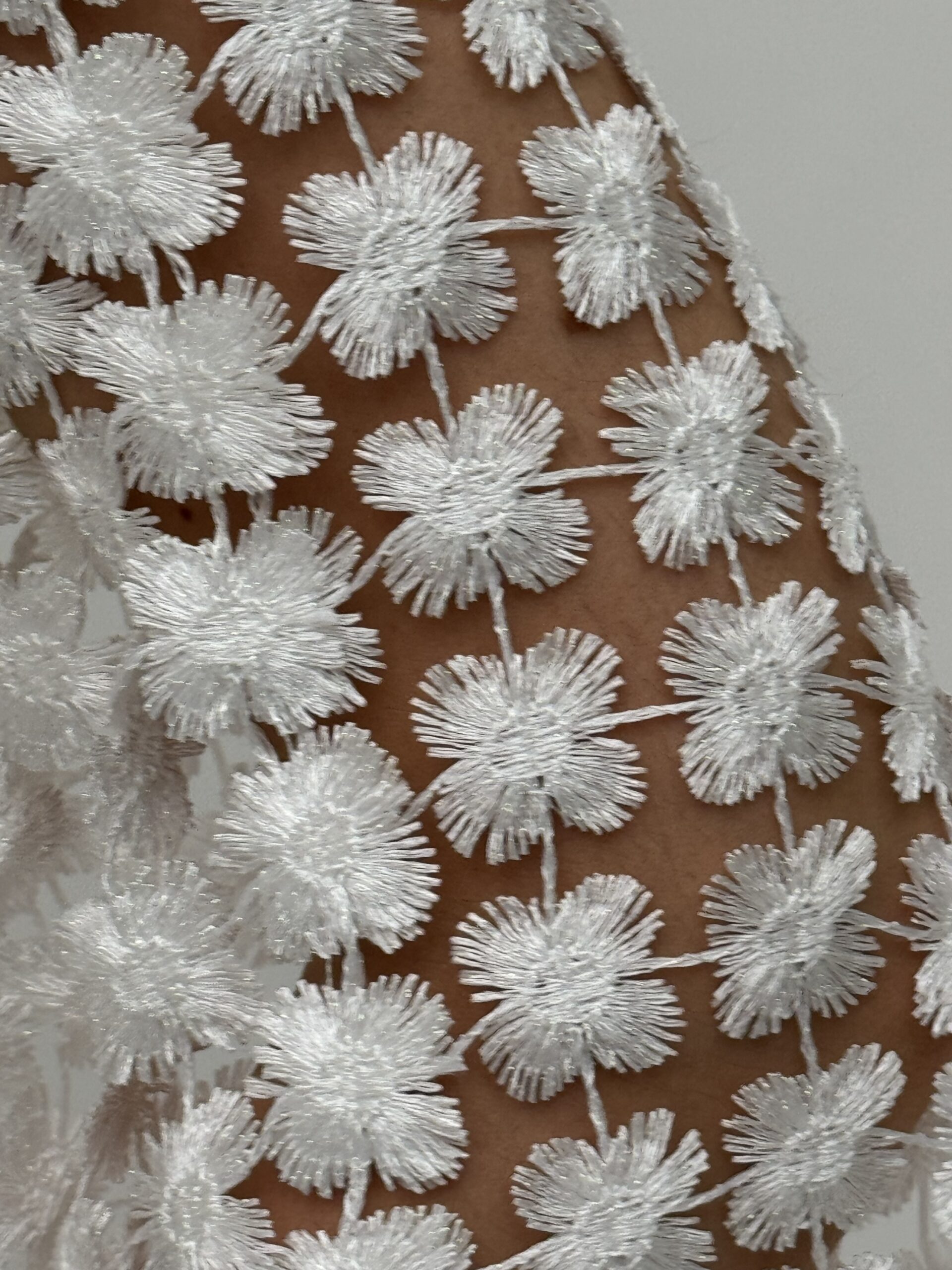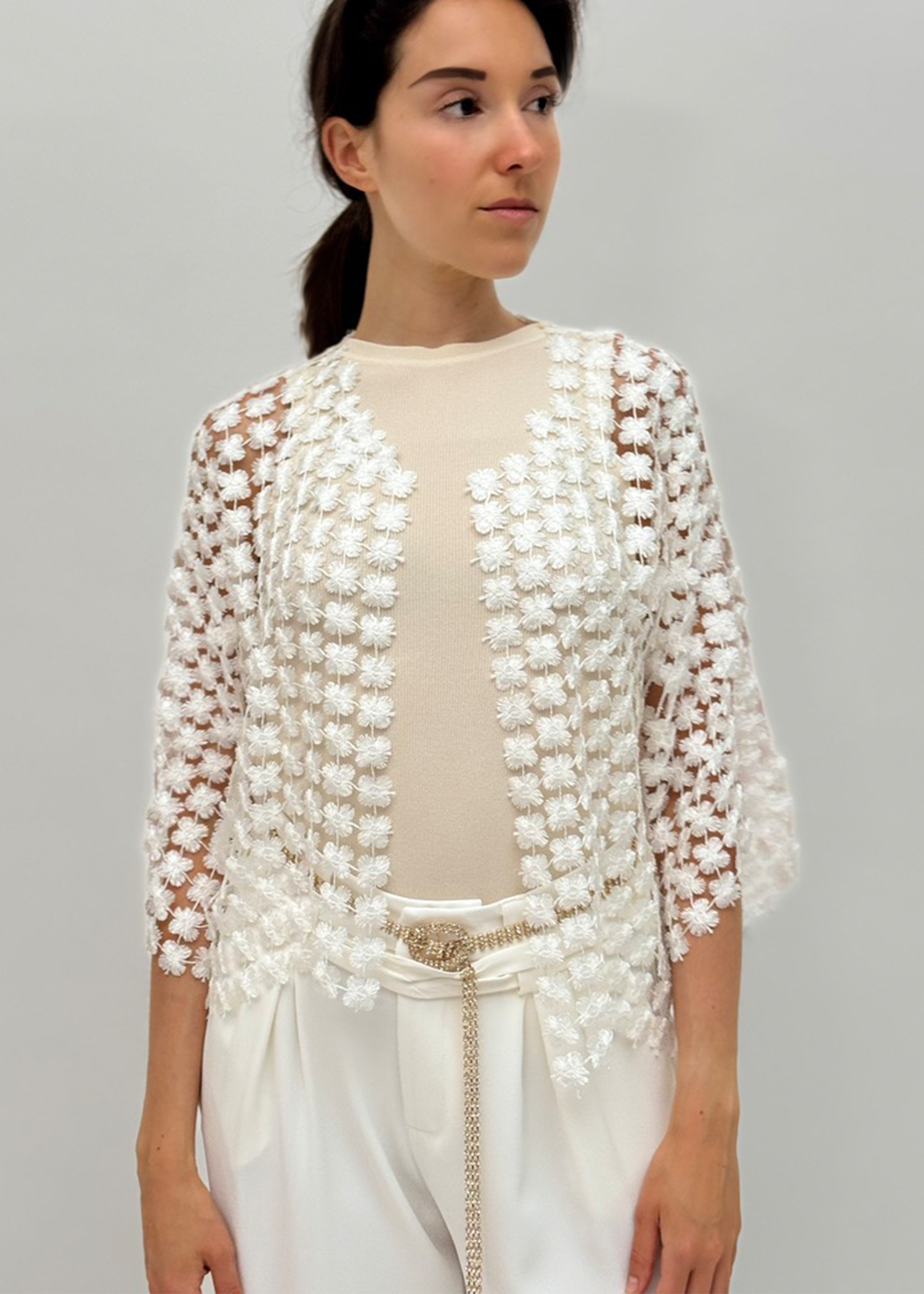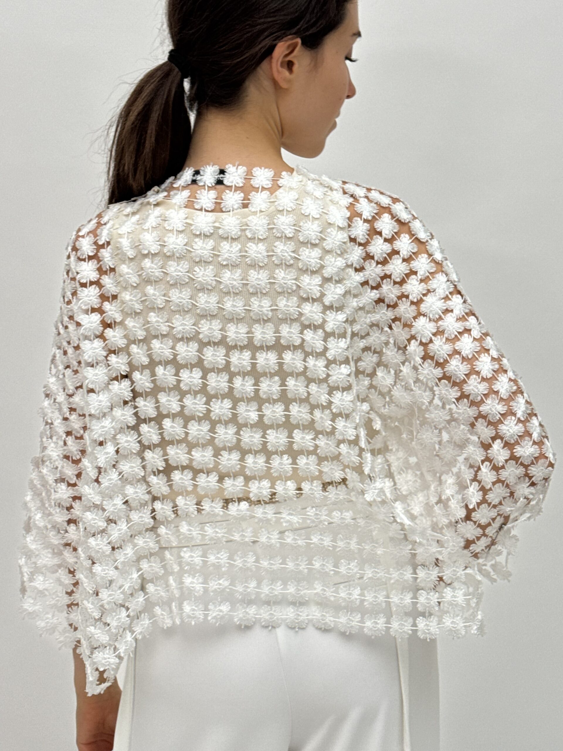 This sheer floral jacket is the perfect accent for your summer look. Lightweight and breathable, with 3/4 sleeves that allow easy movement, while the embroidered 3D flowers add charm and playfulness. Perfectly pairs with shorts, dresses, or even a swimsuit at the beach.