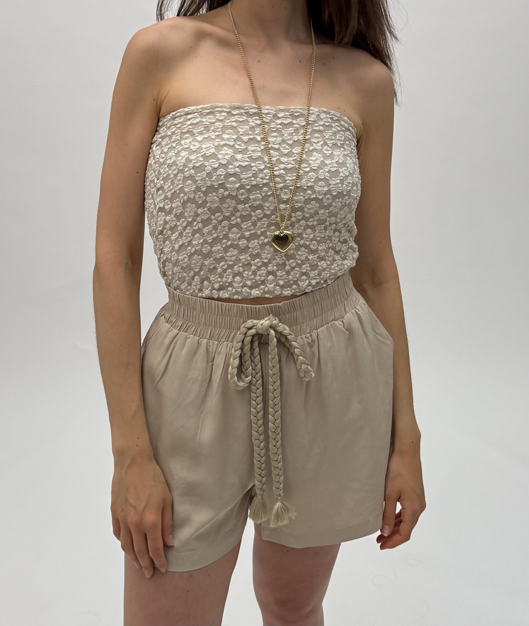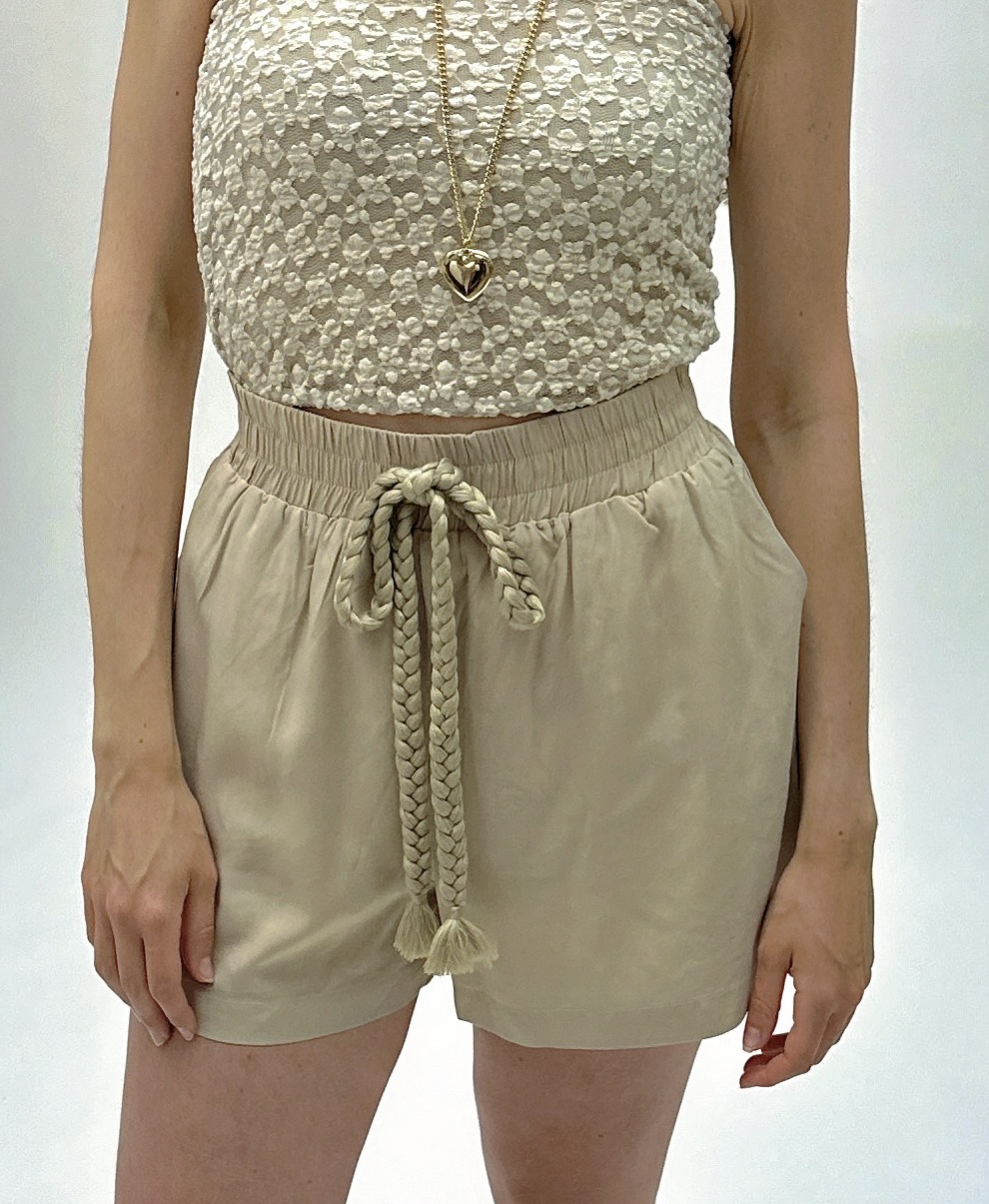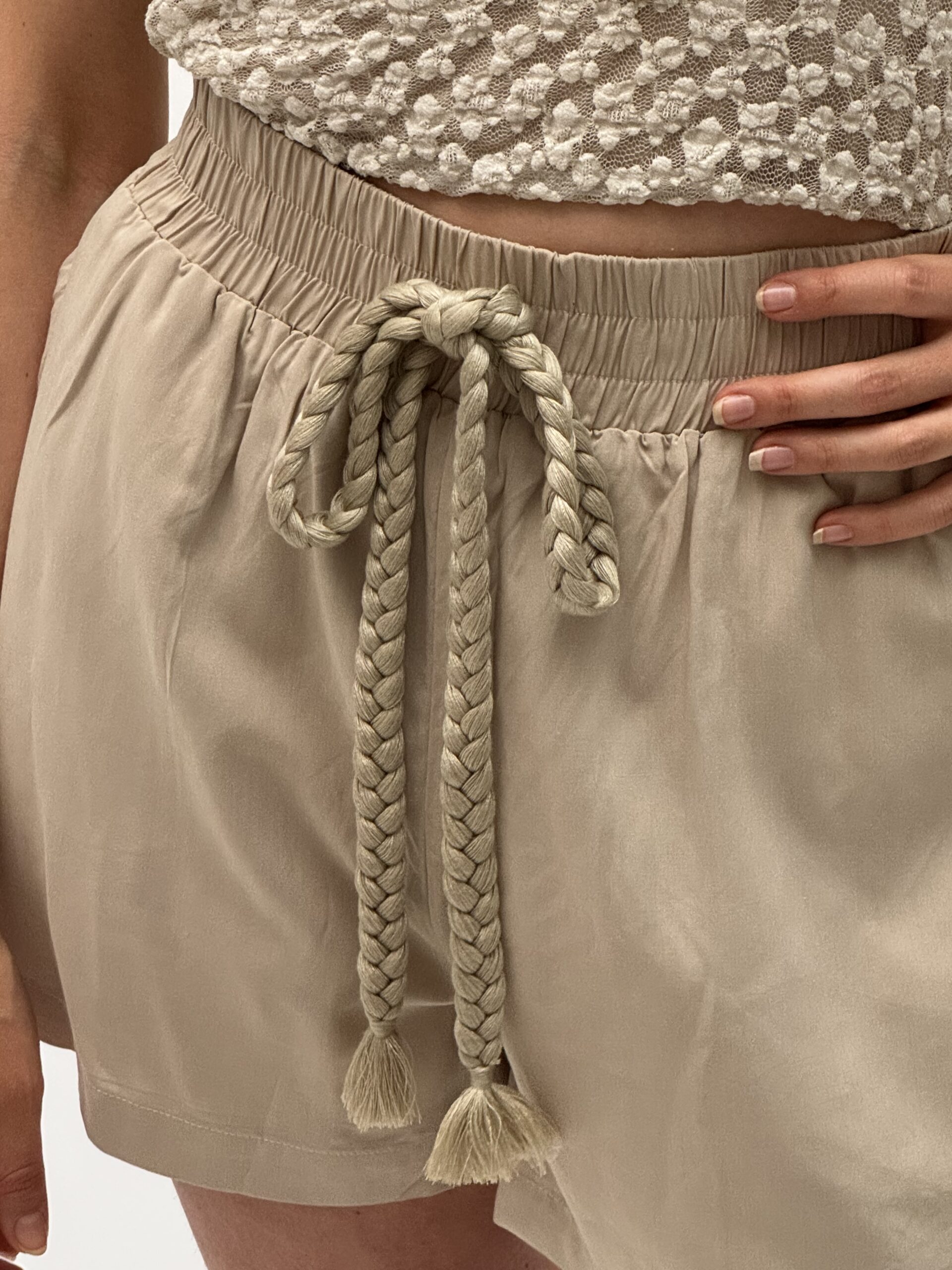 The natural fabric blend ensures a pleasant feel even on hot days, while the soft sheen and braided rope details add a unique, refined touch.
