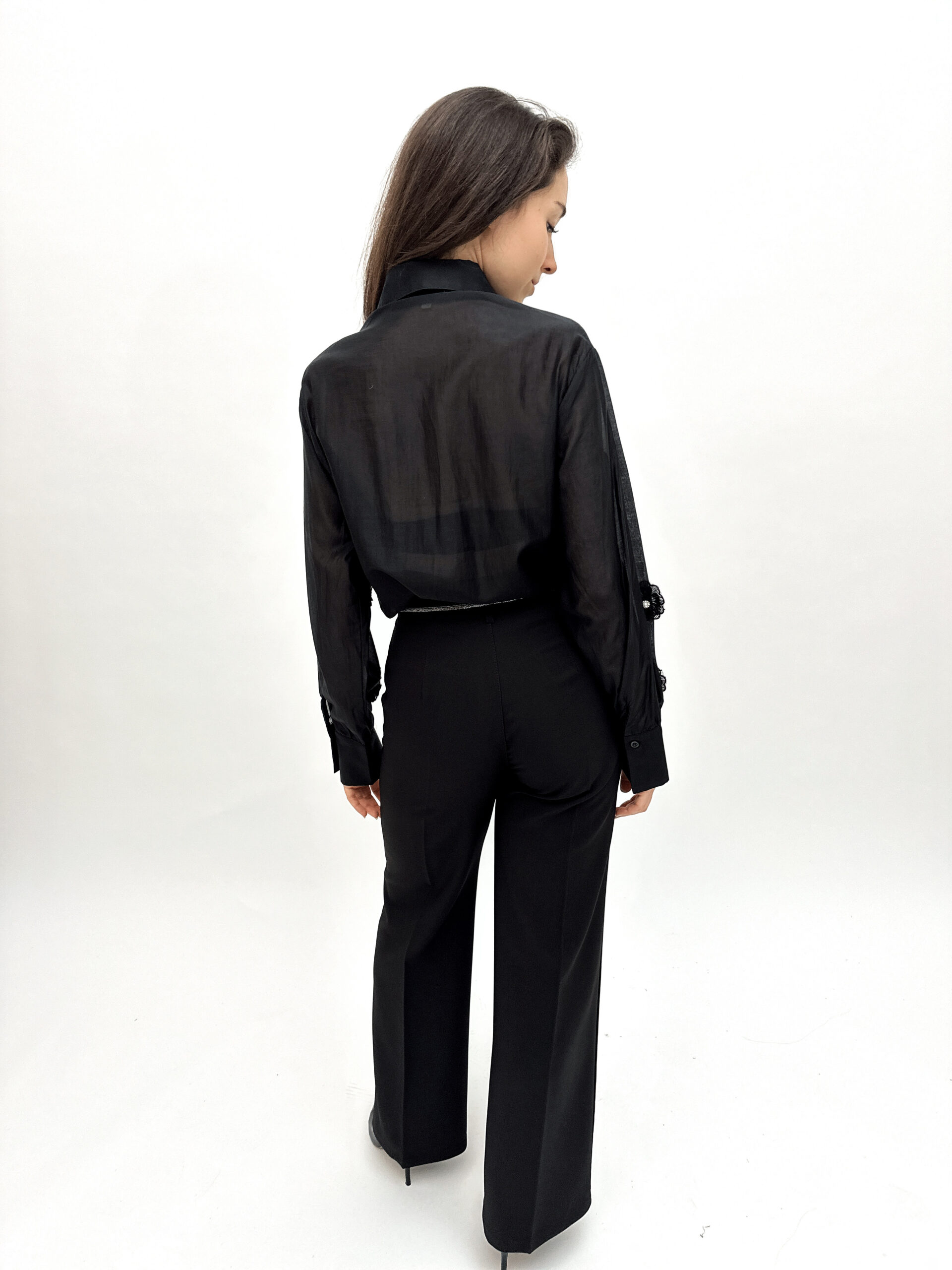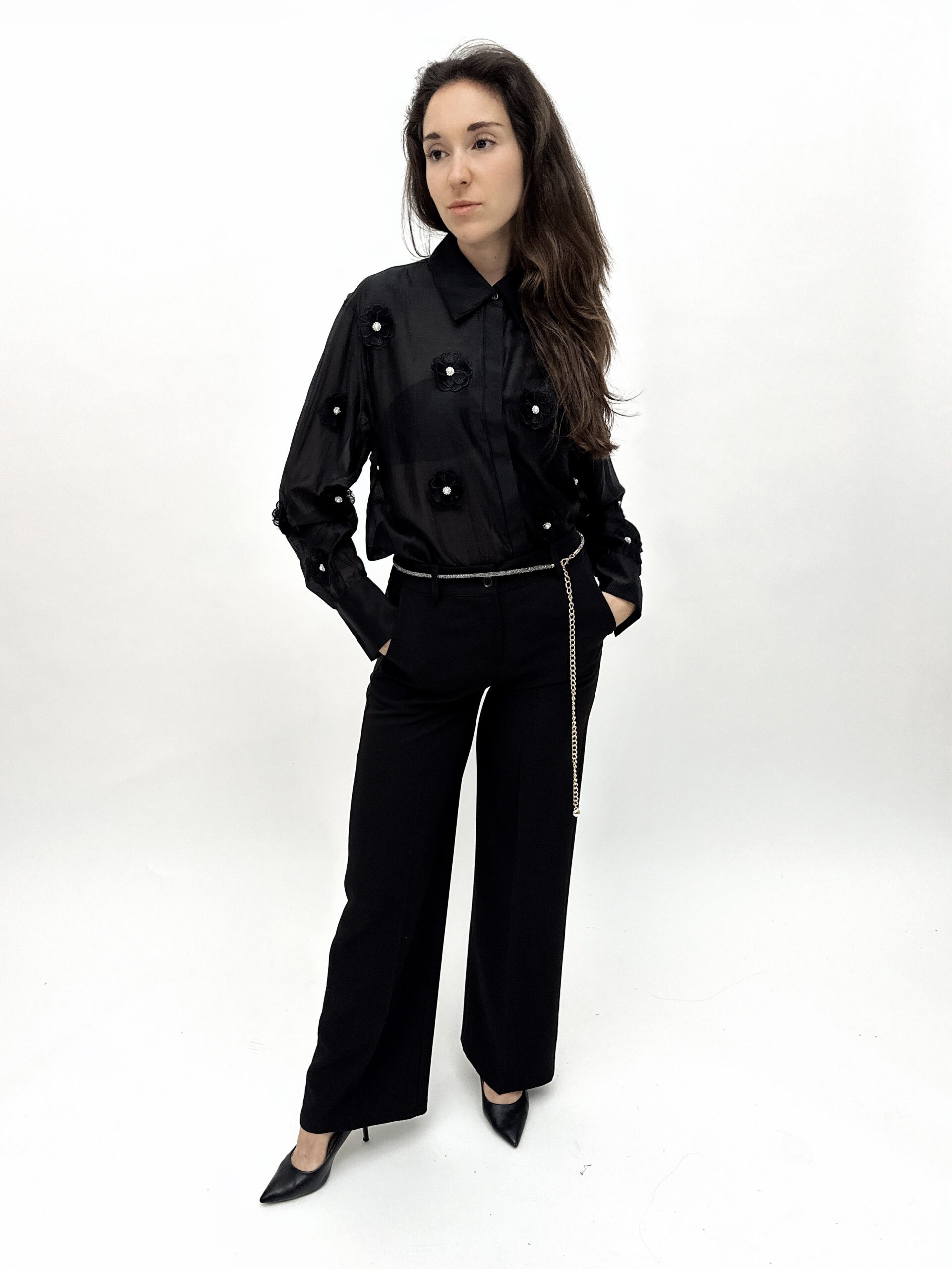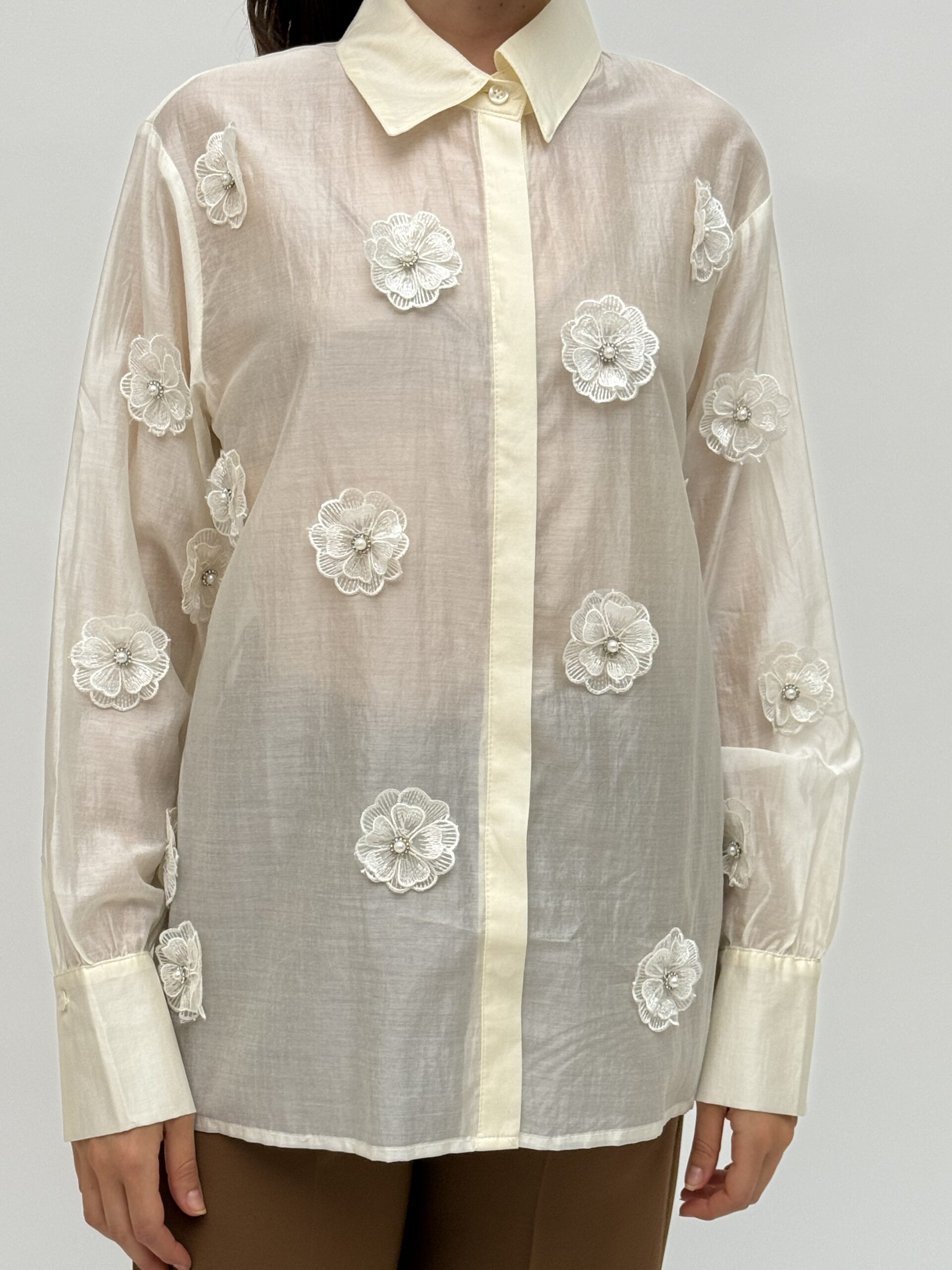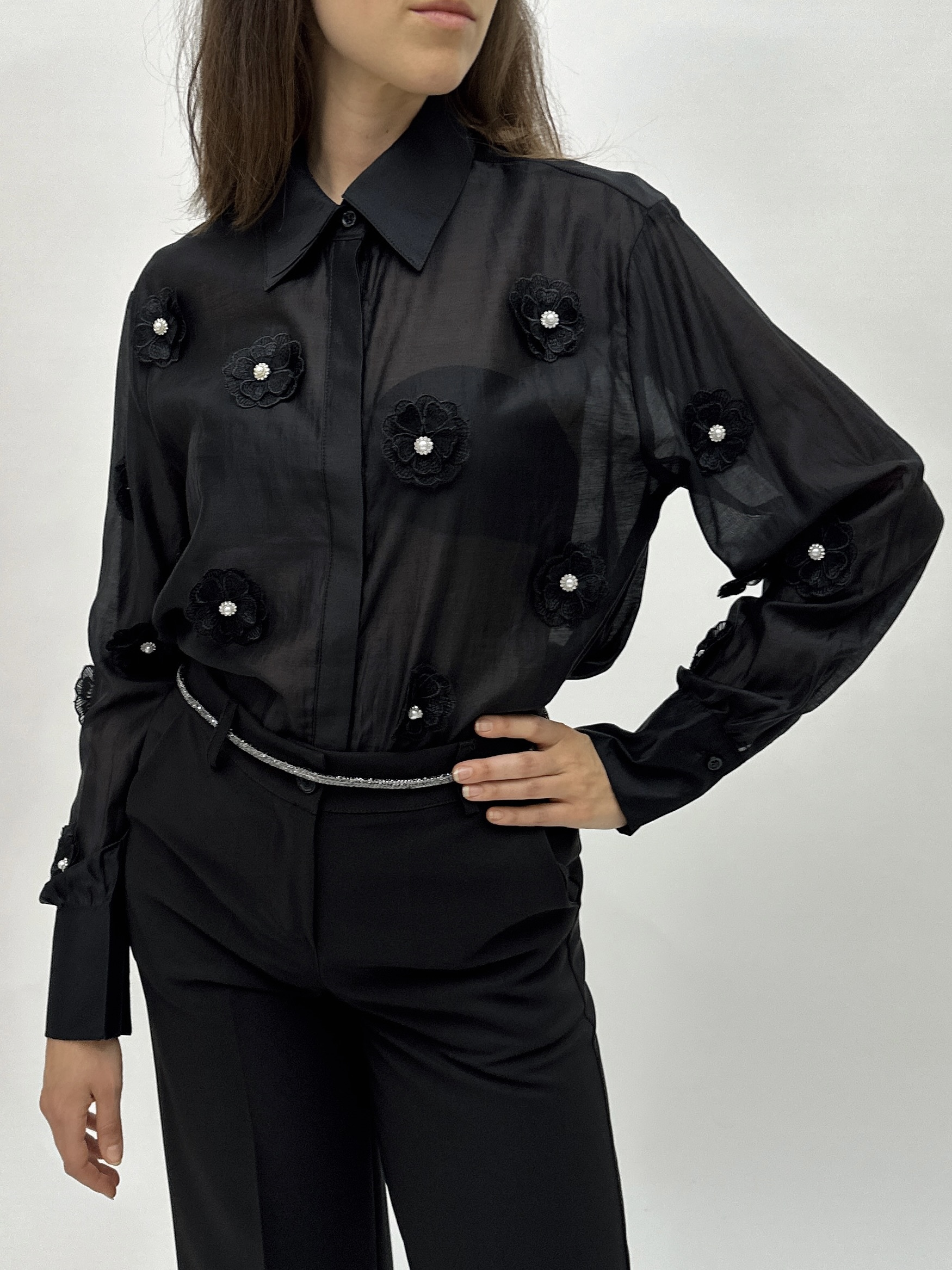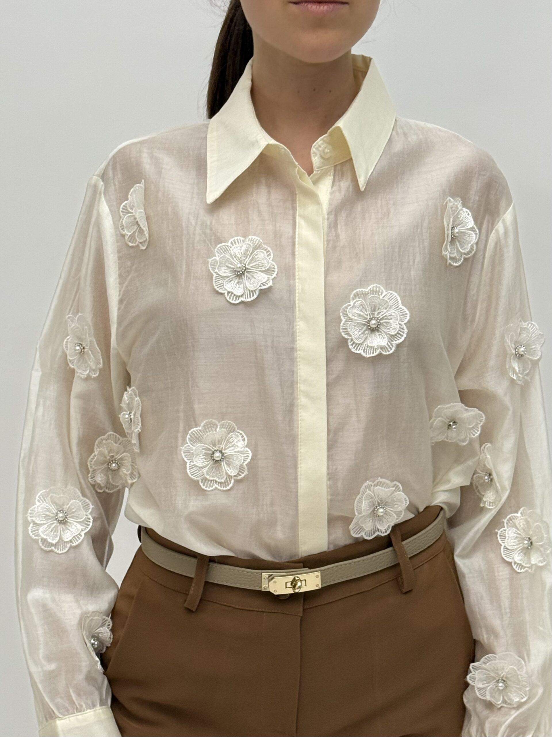 These elegant button-down shirts with 3D floral appliqués are the perfect balance of softness, detail, and modern femininity. The lightly shimmering fabric with silk adds a luxurious touch, while the relaxed fit ensures comfort throughout the day. Ideal for both formal moments and effortlessly chic everyday wear.