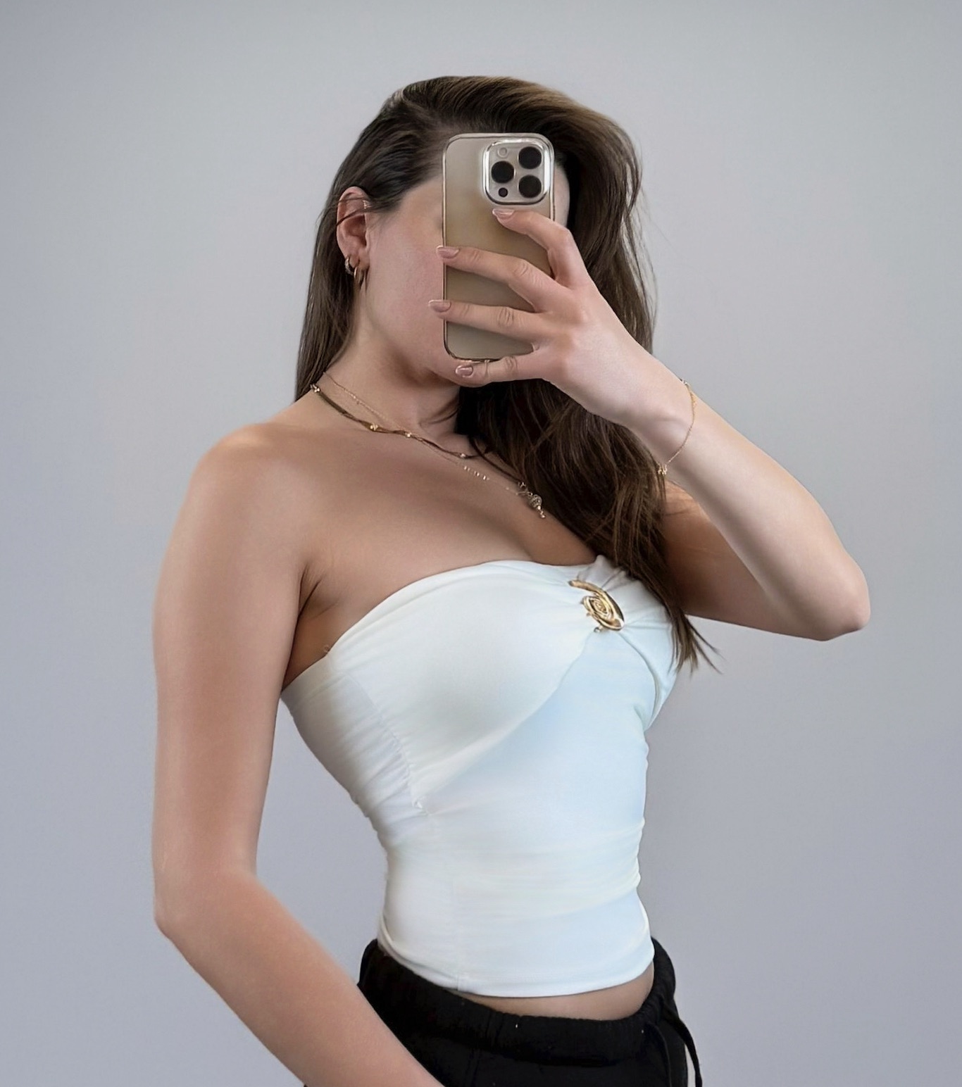 Strapless body Front draped with a central spiral-shaped accent Easily pairs with trousers or skirts – perfect for both day and evening wear.