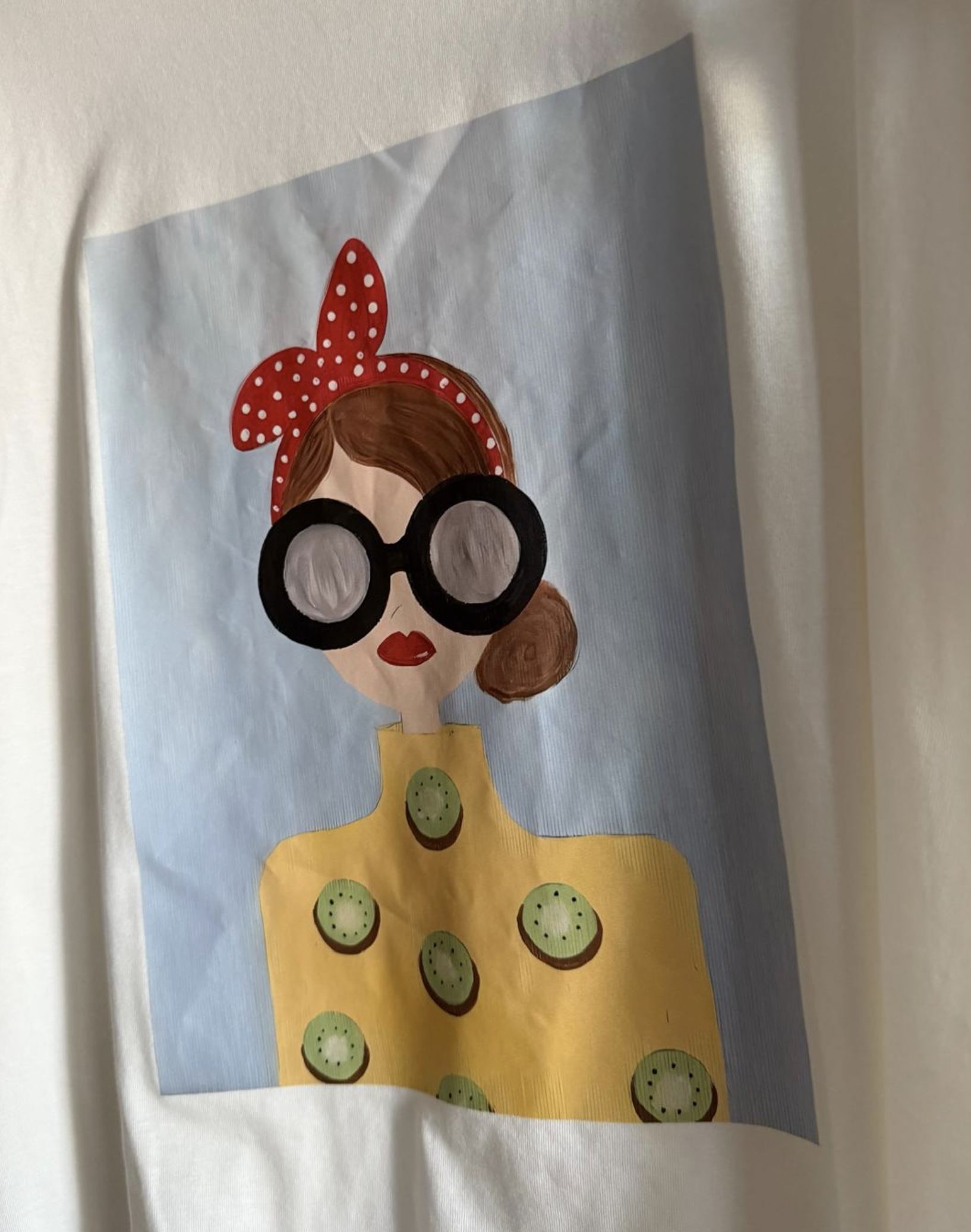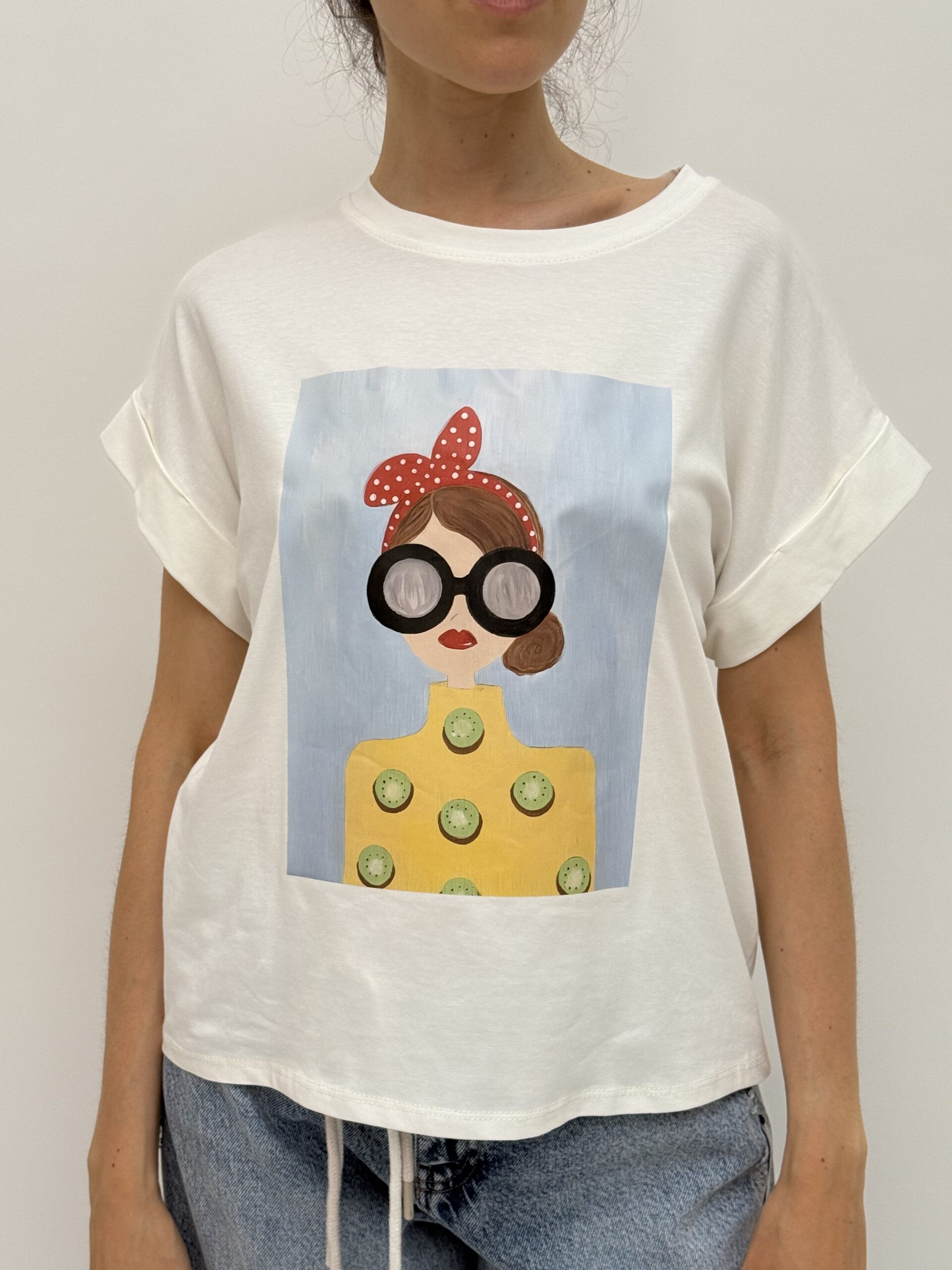 Add a fun, artistic touch to your everyday wardrobe with this white T-shirt featuring a bold illustrated girl print. The design shows a stylish woman with oversized sunglasses and a red polka-dot headband – a playful graphic that makes this tee stand out. With a relaxed fit, short sleeves, and soft fabric, it’s perfect for comfortable yet trendy styling.A detailed answer to provide information about your business, build trust with potential customers, or help the visitor with a problem they may be encountering
