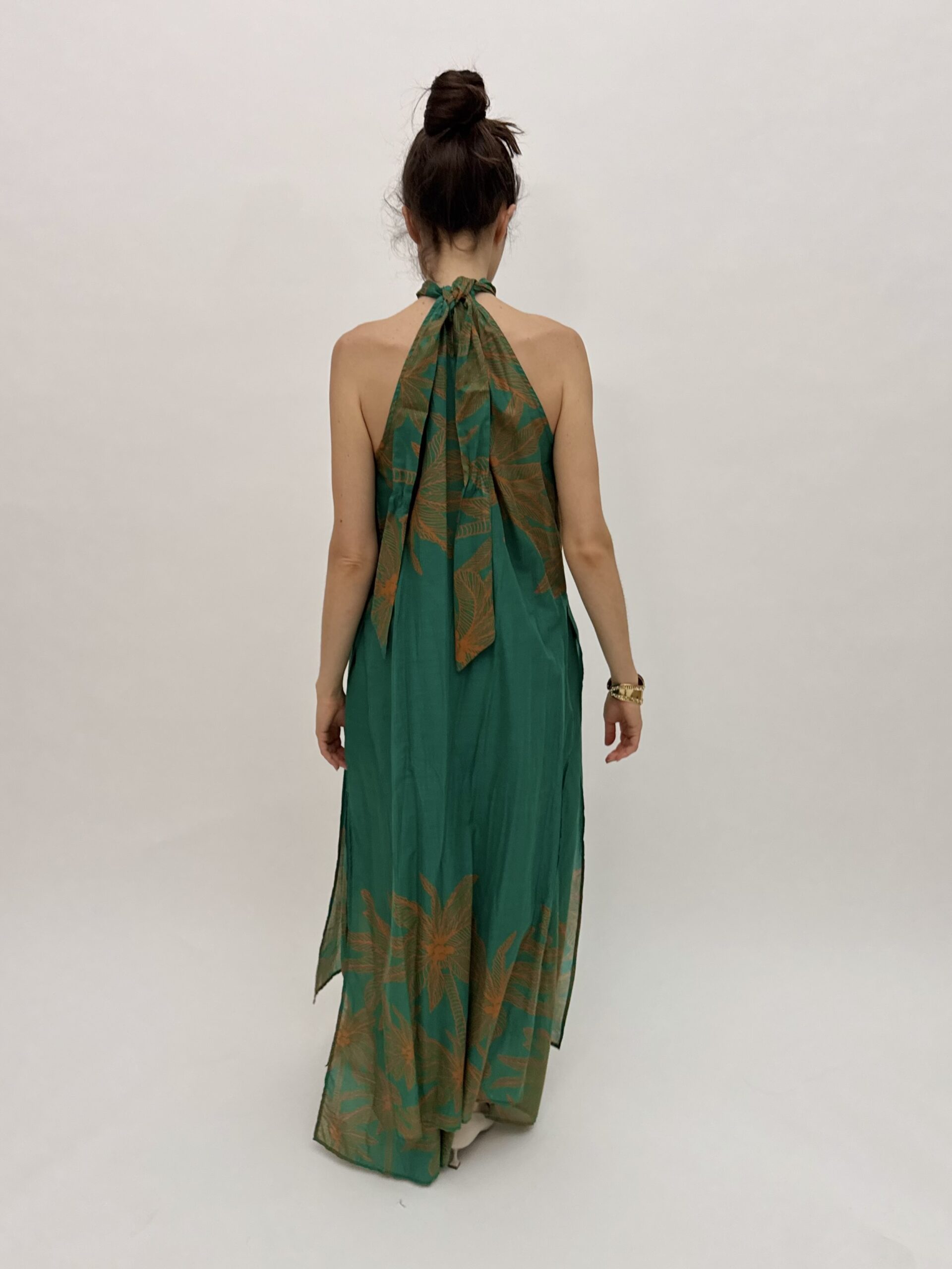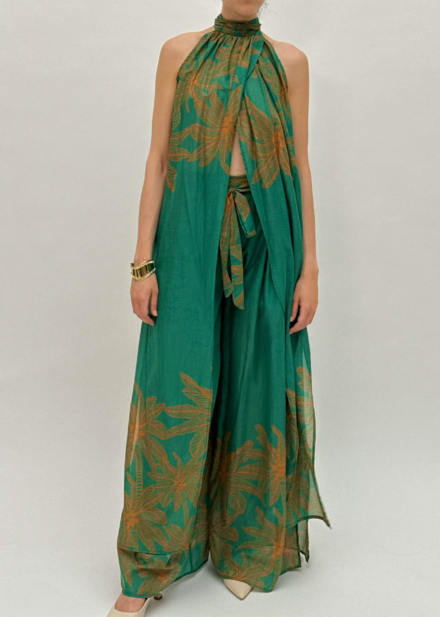 Top: Halter-style neckline with back tie, crisscross front with knot detail subtly covering the waist. Feminine and playful design that enhances the silhouette Trousers: Long, wide-leg trousers with an elasticated waistband and side slits up to the knee. A flowing cut that ensures comfort and freedom of movement.