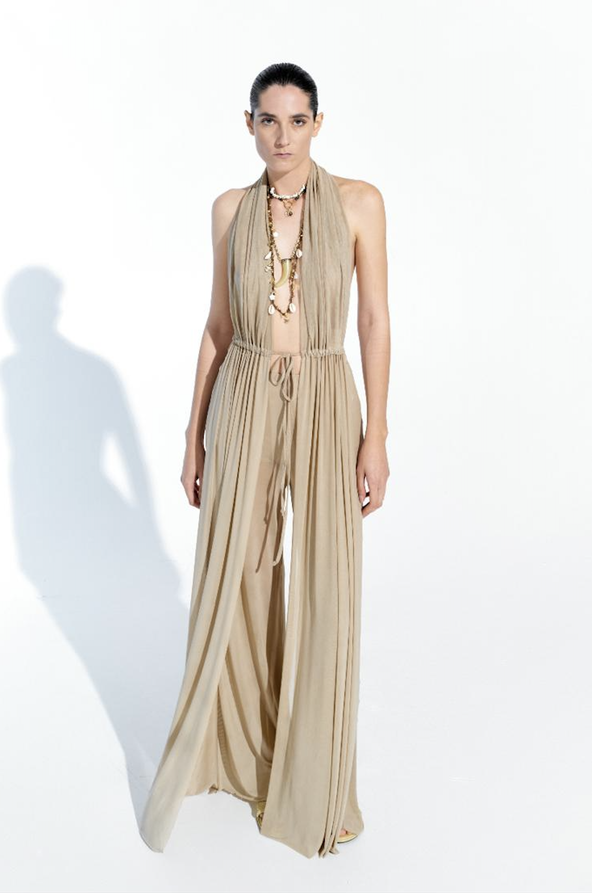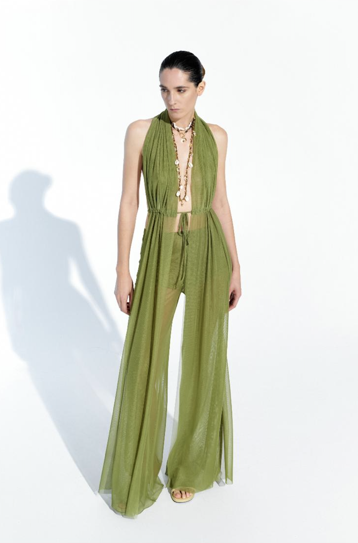 This airy and semi-transparent tulle set is the perfect choice for summer or beach vacations. The wide silhouette allows for freedom of movement, while the open design highlights the figure and adds an elegant, bohemian flair. Both the top and trousers can be worn together or separately to create stylish combinations. 95% polyester, 5% elastane Style: Lightweight and semi-sheer tulle set consisting of a halter-neck top with an open back and wide-leg trousers. The top ties around the neck, and the waist is adjustable with a drawstring.