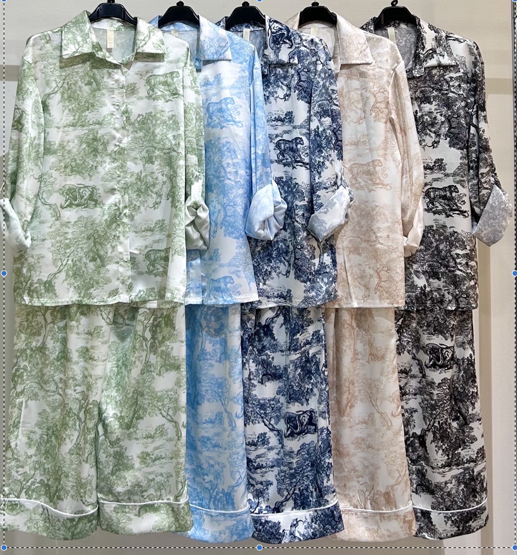 This set is a perfect harmony of comfort and elegance. The refined print is inspired by classic French toile de Jouy featuring trees and wild animals. The breathable fabric gently touches the skin while the relaxed silhouette allows freedom of movement. Perfect for slow mornings at home, stylish city walks, or chic evenings on the terrace. 95% polyester, 5% elastane Soft, lightweight, and breathable material with slight stretch. Style: Straight cut shirt with turn-down collar and long sleeves. Loose fit wide leg trousers with decorative seams at the hem. Coordinated set created for comfort and effortless style. One size relaxed fit suitable for various body types.